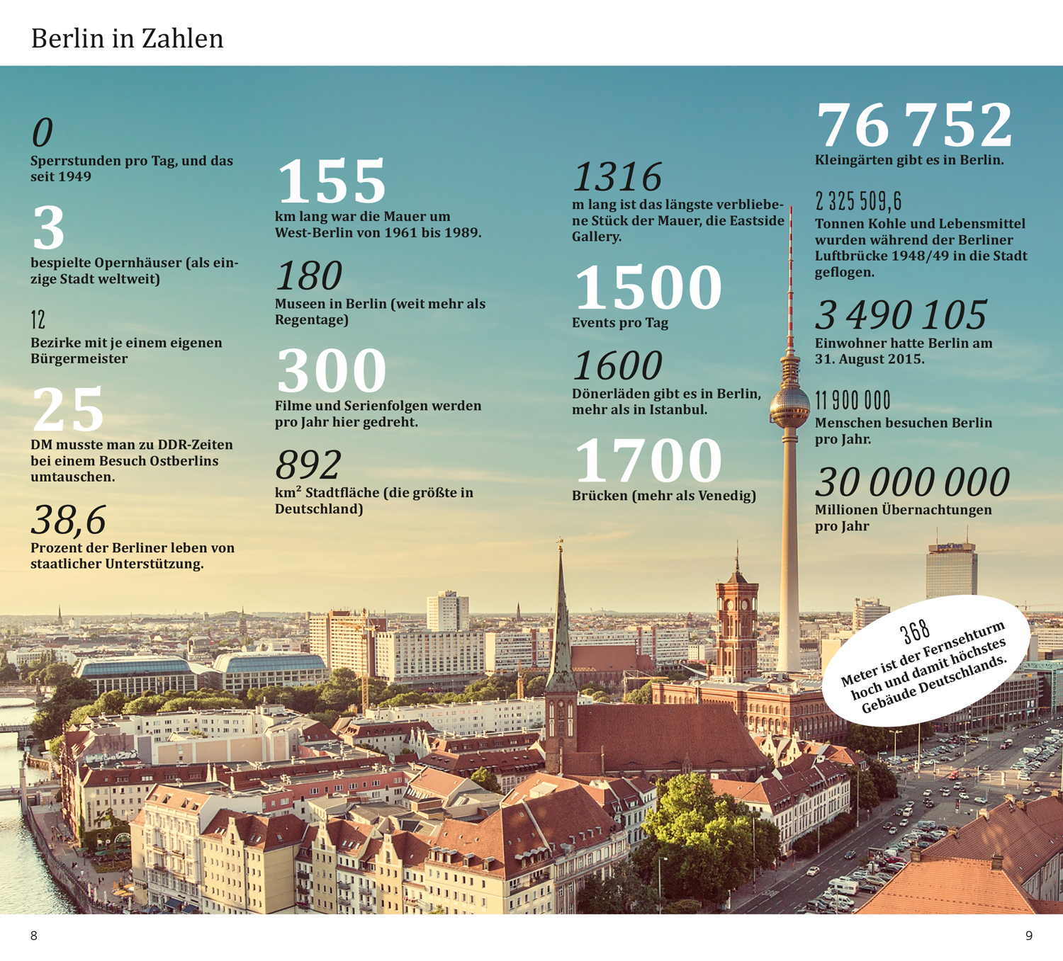 Das Beste zu Beginn. Das ist Berlin. Berlin in Zahlen. Was ist wo? Augenblicke. Ihr Berlin-Kompass. 15 Direktkapitel. Berliner Museumslandschaft. Geschichte und Zeitgeschichte. Pause - einfach mal abschalten. In fremden Betten. Satt & glücklich. Stöbern & entdecken. Wenn die Nacht beginnt. Hin & weg. O- Ton Berlin. Kennen Sie die?