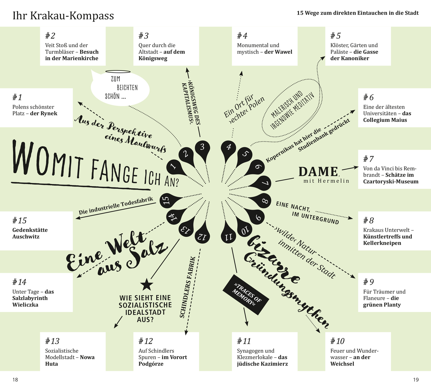 Das Beste zu Beginn. Das ist Krakau. Krakau in Zahlen. Was ist wo? Augenblicke. Ihr Krakau-Kompass. 15 Direktkapitel. Krakauer Museumslandschaft. City of Literature. Kirchen, Pomp und Passion. Pause - einfach mal abschalten. In fremden Betten. Satt & glücklich. Stöbern & entdecken. Wenn die Nacht beginnt. Hin & weg. O-Ton Krakau. Kennen Sie die?