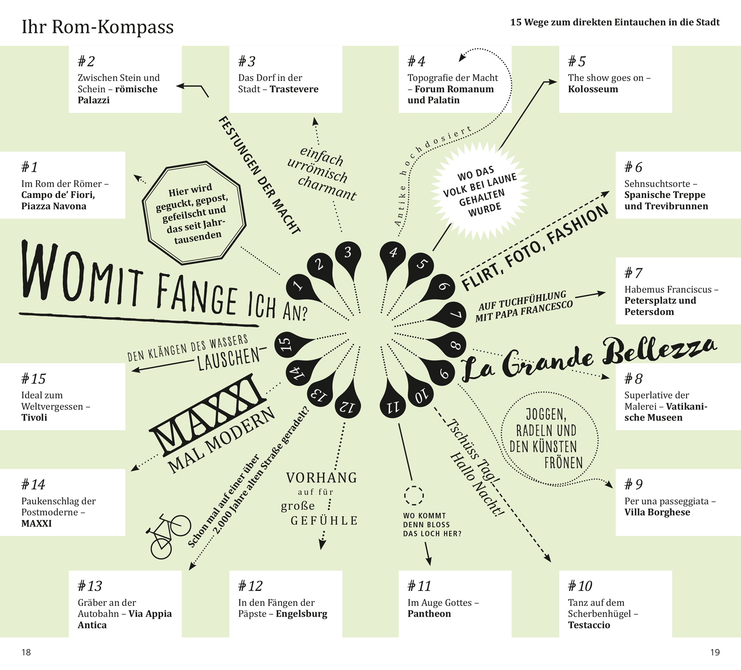 Das Beste zu Beginn. Das ist Rom. Rom in Zahlen. Was ist wo? Augenblicke. Ihr Rom-Kompass. 15 Direktkapitel. Roms Museumslandschaft. Achäologische Stätten und Museen. Pause – einfach mal abschalten. In fremden Betten. Satt & glücklich. Stöbern & entdecken. Wenn die Nacht beginnt. Hin & weg. O-Ton Rom. Kennen Sie die?