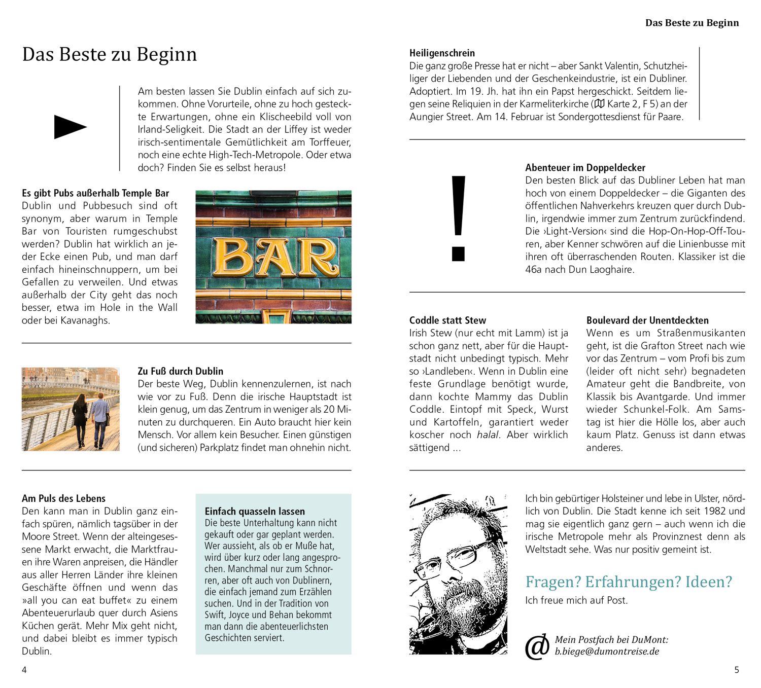 Das Beste zu Beginn. Das ist Dublin. Dublin in Zahlen. Was ist wo? Augenblicke. Ihr Dublin-Kompass. 15 Direktkapitel. Dubliner Museumslandschaft. Rebellen in Dublin. Dublins architektonisches Erbe. Pause – einfach mal abschalten. In fremden Betten. Satt & glücklich. Stöbern & entdecken. Wenn die Nacht beginnt. Hin & weg. O-Ton Dublin. Kennen Sie die?