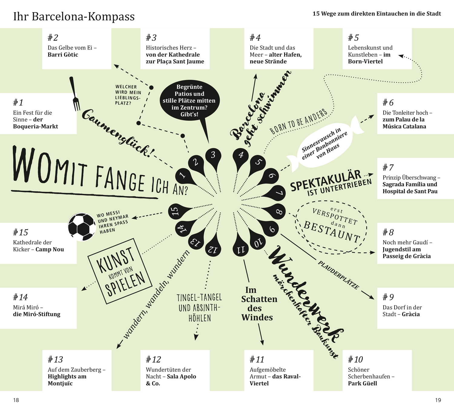 Das Beste zu Beginn. Das ist Barcelona. Barcelona in Zahlen. Was ist wo? Augenblicke. Ihr Barcelonas-Kompass. 15 Direktkapitel. Barcelonas Museumslandschaft. Renaixenca - Kataloniens Wiedergeburt. Pause – Einfach mal abschalten. In fremden Betten. Satt & glücklich. Stöbern & entdecken. Wenn die Nacht beginnt. Hin & weg. O- Ton Barcelona. Kennen Sie die?