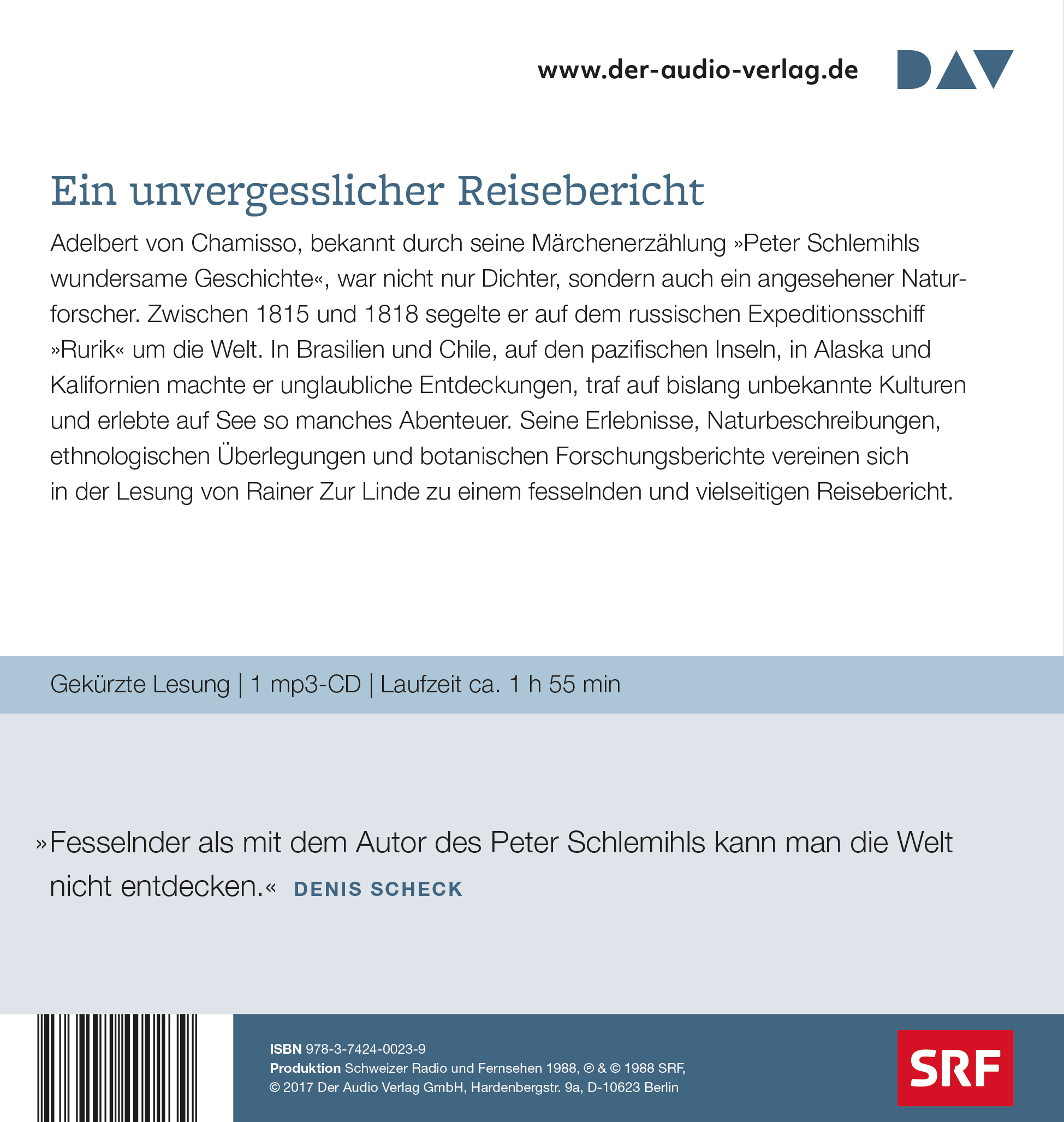 | Schlagworte | Adelbert-von-Chamisso-Preis • Alaska • Amerika • Hörbuch; Literaturlesung • Klassische Belletristik • Naturforscher • Nordamerika • Nordamerika, physisch • Peter Schlemihl • Reisebericht • Reiseberichte, Reiseliteratur • Tagebücher, Briefe, Notizbücher • Weltumsegler |