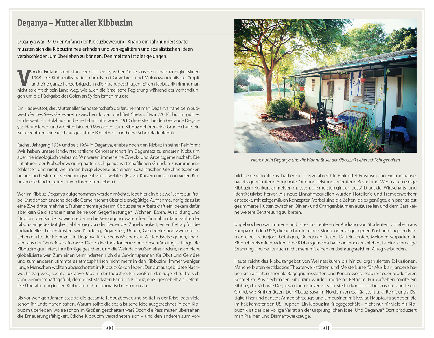 Ort für Ort hat Michel Rauch ausgesuchte Unterkünfte, Restaurants oder Einkaufsadressen zusammengestellt; sie sind in den Cityplänen verortet. Wanderungen erschließen so unterschiedliche Landschaften wie die grünen Hügel von Galiläa oder den riesigen Erosionskrater Makhtesh Ramon in der Wüste Negev.
