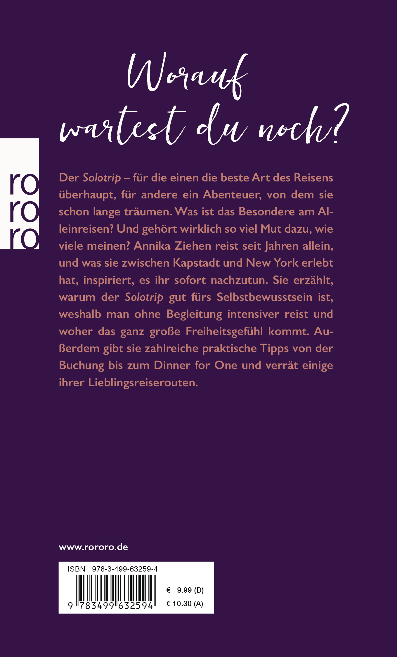 Dieses Buch ist eine Liebeserklärung an das Reisen. Eingebettet in zahlreiche Anekdoten von unterwegs, nennt Annika Ziehen tausend gute Gründe, die dafür sprechen, lieber allein die Koffer zu packen, als gar nicht zu reisen. Sie erzählt, warum der Solotrip gut fürs Selbstbewusstsein ist, weshalb man ohne Begleitung intensiver reist, was am Eat-Pray-Love-Mythos dran ist und woher das ganz große Freiheitsgefühl kommt. Und sie verrät, was man bei der Reiseplanung alles beachten sollte, warum du genauso gut mit Rollkoffer wie mit Rucksack reist, wie man auch allein unterwegs Momente mit anderen teilen kann und wie das Dinner for One - die Krönung des Alleinreisens - zum Vergnügen wird.