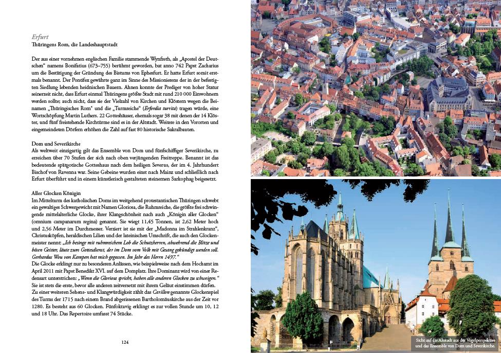 Thüringen ist eine Schatzkammer voller Kostbarkeiten, die in Museen, Kirchen, Klöstern, den vom Glanz höfischen Lebens zeugenden Burgen und in 30 Residenzschlössern zu finden sind. Von ganz eigenem Charakter sind an den Kreuzungen historischer Handelswege die Städte Eisenach, Gotha, Erfurt, Weimar, Jena und Gera. Erfurt, die Hauptstadt des Landes, galt schon vor tausend Jahren als das "Thüringische Rom", wegen der Vielzahl der Brücken (240!) und der Türme der Gotteshäuser. Allein in der Altstadt sind es 22, überragt vom einzigartigen Ensemble aus Dom und Severikirche.