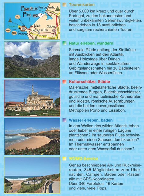 TourenkartenÜber 5000 km kreuz und quer durch Portugal, zu den bekanntesten und vielen unbekannten Sehenswürdigkeiten, beschrieben in 13 ausführlichen und sorgsam recherchierten Touren.Natur erleben, wandernSchmale Pfade entlang der Steilküste mit Ausblicken auf den Atlantik, lange Holzstege über Dünen und Wanderwege in spektakulären Gebirgslandschaften hin zu Badestellen an Flüssen oder Wasserfällen.Kulturschätze, StädteMalerische, mittelalterliche Städte, beeindruckende Burgen, Bilderbuchschlösser, gotische und manuelinische Kathedralen und Klöster, römische Ausgrabungen und die beiden unvergesslichen Metropolen Porto und Lissabon.Wasser erleben, badenIn den Wellen des wilden Atlantik toben oder lieber in einer ruhigen Lagune plantschen? Im sauberen Fluss schwimmen oder einen Stausee durchkraulen? Im Thermalwasser entspannen oder unter dem Wasserfall duschen?WOMO-ServiceGenau beschriebene An- und Rückreiserouten, 345 Möglichkeiten zum Übernachten, Campen, Baden oder Rasten, alle mit GPS-Koordinaten. Über 340 Farbfotos, 16 Karten und viele,viele Tipps.