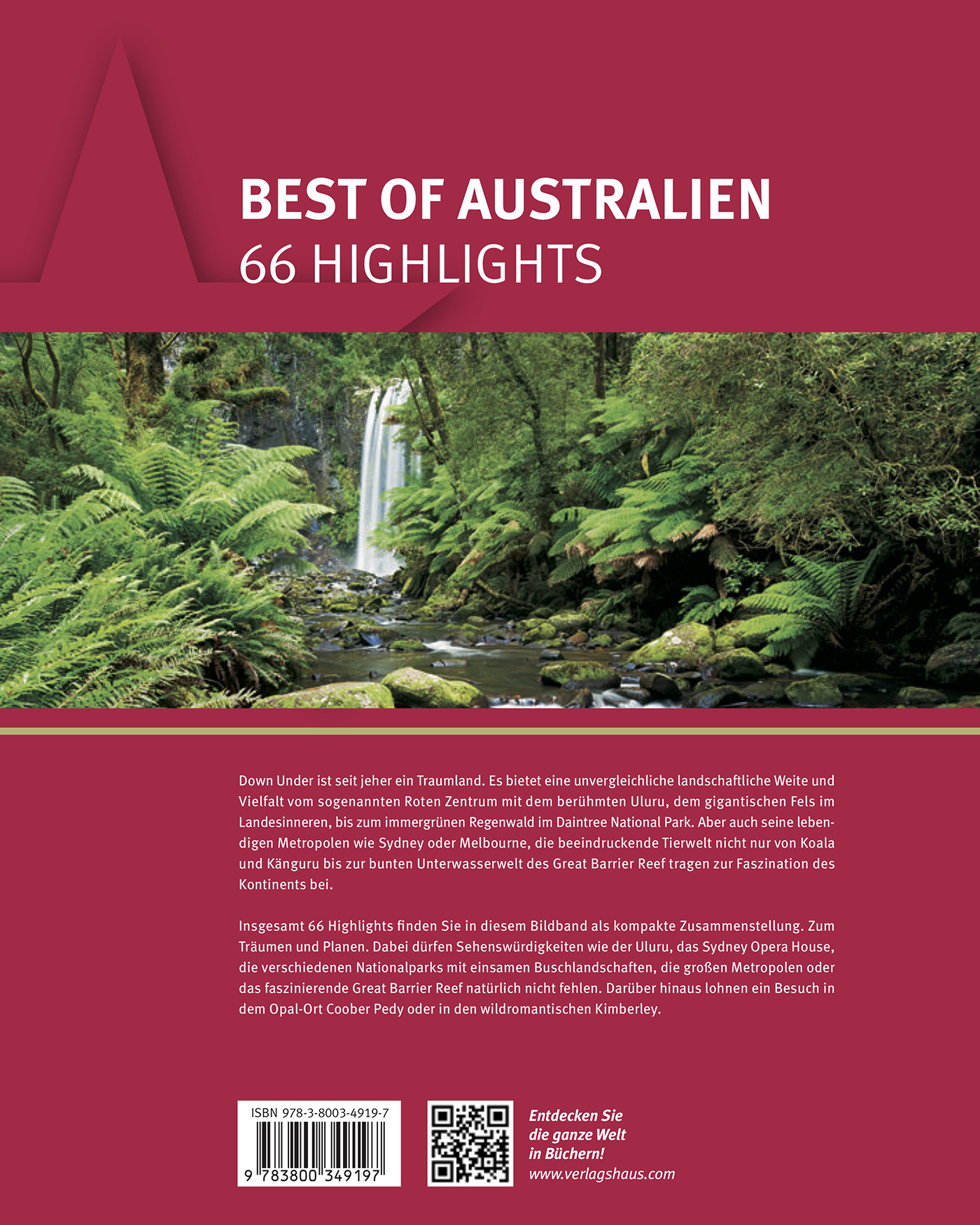 "Best of Australien" stellt die 66 lohnenswertesten Reiseziele vor. Dabei dürfen Sehenswürdigkeiten wie der Uluru, das Sydney Opera House, die verschiedenen Nationalparks mit einsamen Buschlandschaften, die großen Metropolen oder das faszinierende Great Barrier Reef natürlich nicht fehlen. Darüber hinaus bringen aber auch etwa ein Besuch bei einem Aborigine-Künstler oder eines Gourmetrestaurants in Sydney diesen so faszinierenden Kontinent nahe.