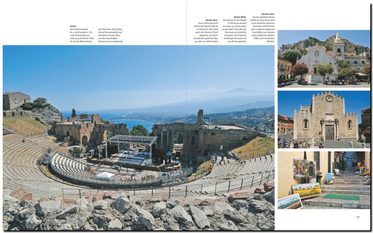 Über 200 Bilder zeigen Sizilien in all seinen Facetten. Vier Specials berichten über die vielfältige sizilianische Küche, das antike Syrakus, die Barockstädte Ragusa, Noto und Modica sowie über den Vulkanismus.
