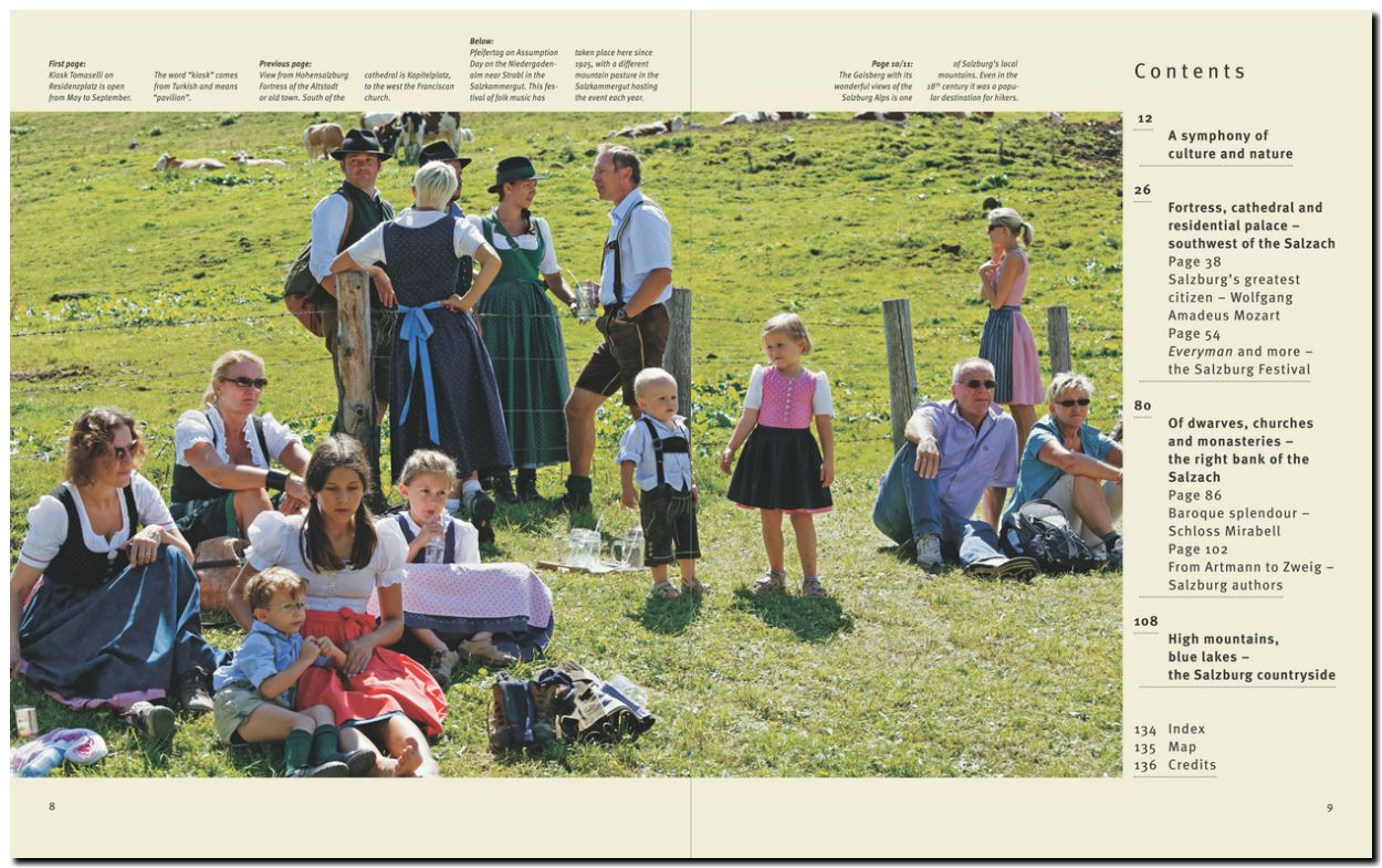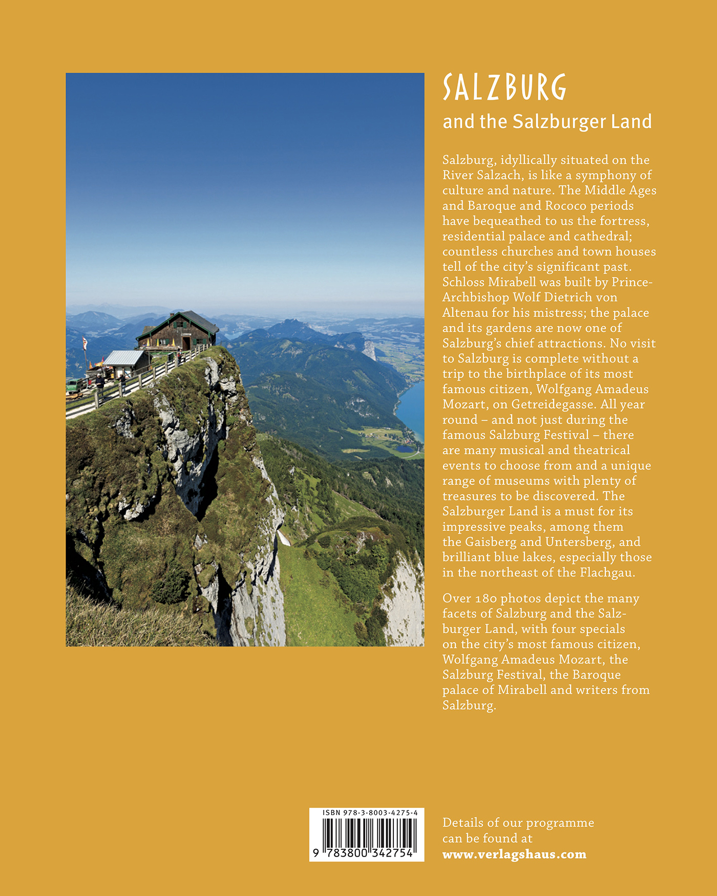 Über 180 Bilder zeigen Salzburg und seine Umgebung in allen Facetten. Vier Specials berichten über das Barockschloss Mirabell, die Salzburger Festspiele, den Mythos Mozart und über Schriftsteller, die besonders mit der Stadt verbunden waren.