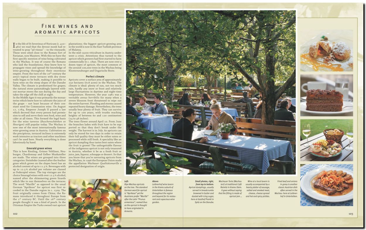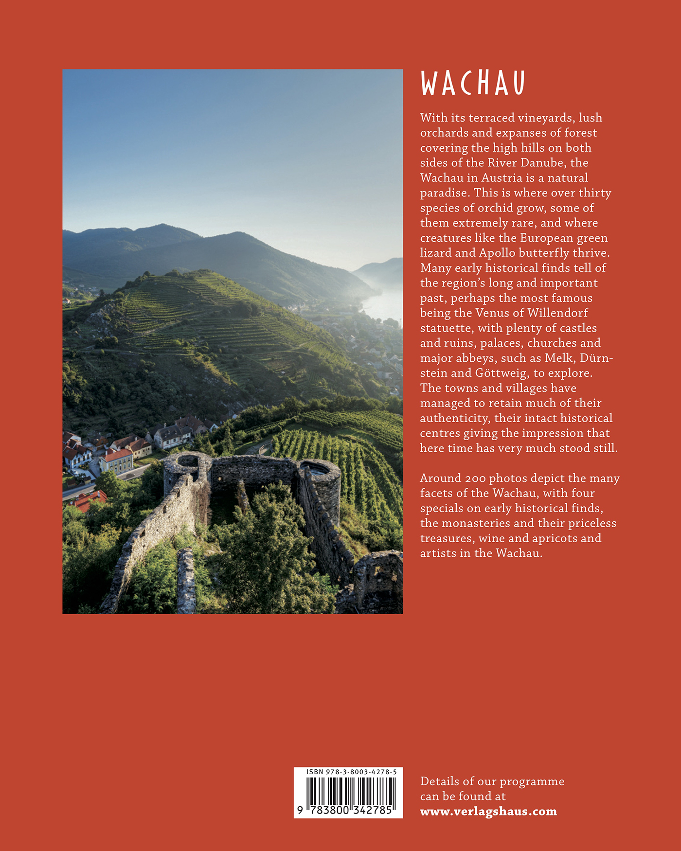 Über 190 Bilder zeigen die ganze Vielfalt der Wachau. Vier Specials erzählen von den frühgeschichtlichen Funden, von den Klöstern und ihren Schätzen, vom Wein und der Marille, und von den Künstlern in Wachau.