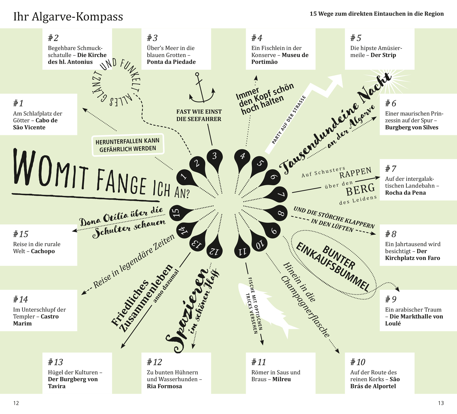 Das Beste zu Beginn. Das ist die Algarve. Algarve in Zahlen. So schmeckt die Algarve. Ihr Algarve-Kompass: Felsalgarve, die westliche Hügellandschaft, rund um die Stadt Faro, die Sandalgarve sowie Rio Guadiana und der Nordosten. Hin & weg. O-Ton Algarve. Kennen Sie die?