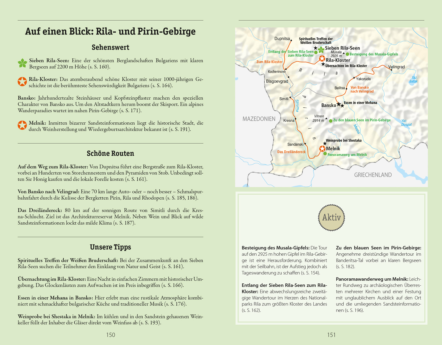 Von Sofia über die Nationalparks Rila und Pirin bis Südbulgarien, vom Balkan bis zum Schwarzen Meer werden alle sehenswerten Regionen und Städte beschrieben. Zu jedem Kapitel präsentiert eine Doppelseite "Auf einen Blick" die Highlights, die schönsten Routen, aktive Naturerlebnisse und besondere Tipps der Autoren. Ort für Ort haben Simone Böcker und Georgi Palahutev ausgesuchte Unterkünfte, Restaurants oder Einkaufsadressen zusammengestellt, die in den Cityplänen eingezeichnet sind. Wanderungen erschließen die schönsten Landschaften, etwa die herrliche Umgebung des Rila-Klosters im gleichnamigen Nationalpark, den Iskar-Durchbruch im Westbalkan oder den Naturpark Zlatni Pyasatsi am Schwarzen Meer. Viel Wissenswertes über Bulgarien, über die Geschichte und Gegenwart oder den Alltag der Menschen, lässt sich in der einführenden Landeskunde wie in den eingestreuten Themenseiten nachlesen.