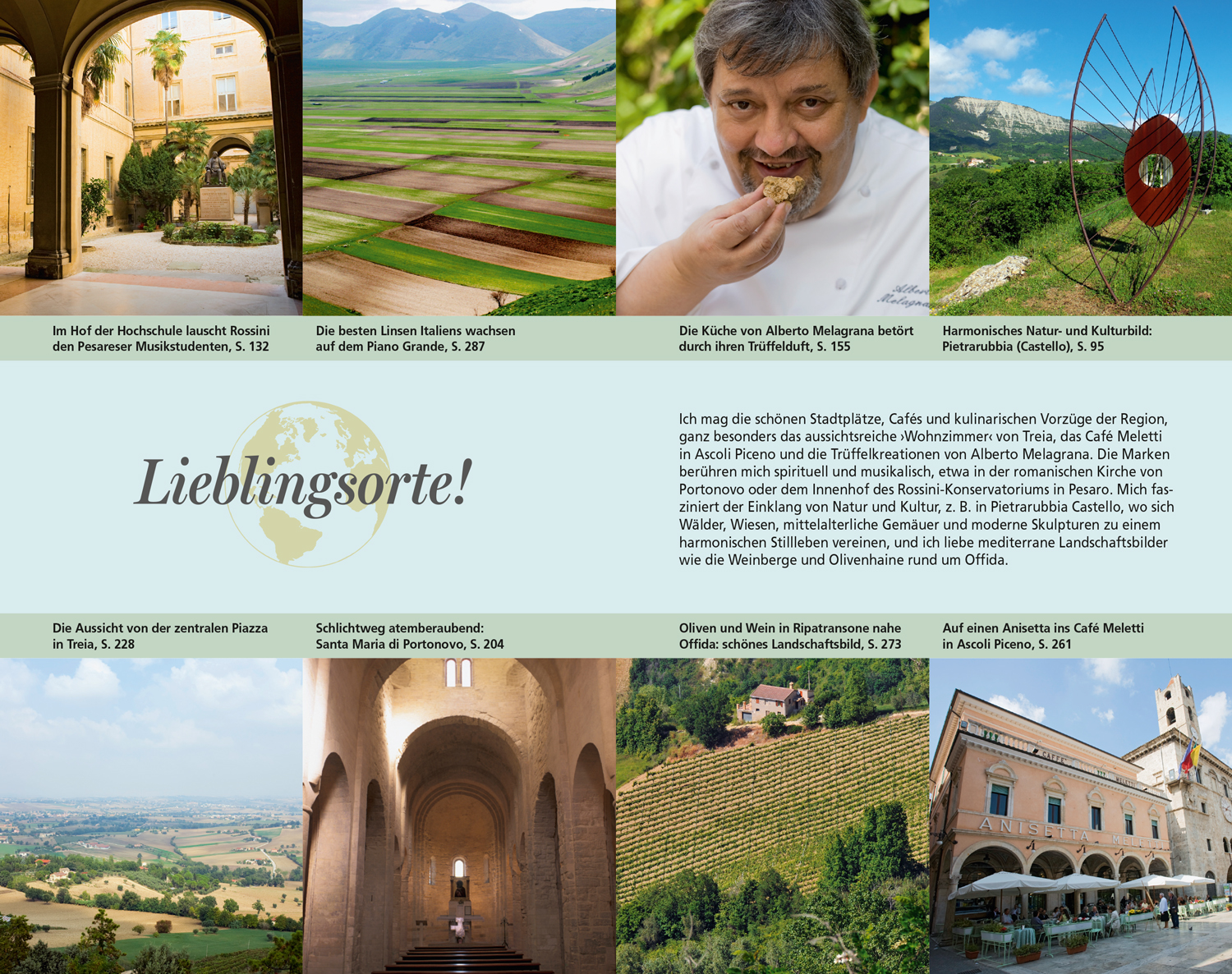 Außerdem zeigt die Autorin dem Leser die schönsten Rad- und Wanderwege der Marken, und mit gut 180 Strandkilometern bieten die Seebäder beste Bedingungen für Schwimmer, Surfer und Taucher. Kulinarik-Fans achten auf die zahlreichen Shopping-Tipps für Wein und Öl oder auf einige Lieblingsorte der Autorin: das Jugendstil-Café "Meletti" in Ascoli Piceno oder das Restaurant von Alberto Melagrana, der deliziöse Trüffelgerichte auf die Teller zaubert.