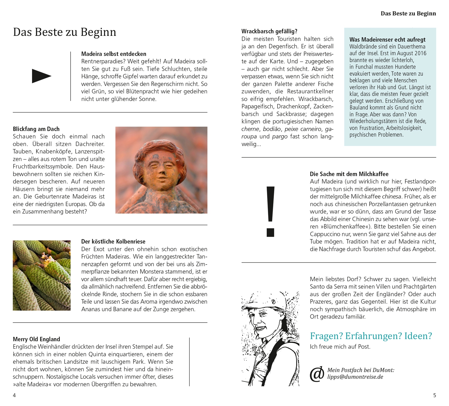 Das Beste zu Beginn. Das ist Madeira. Madeira in Zahlen. So schmeckt Madeira. Ihr Madeira-Kompass: Rund um Funchal, Inselosten, Inselwesten, die Nordseite und die kleinen Inseln. Hin & Weg. O-Ton Madeira. Kennen Sie die?