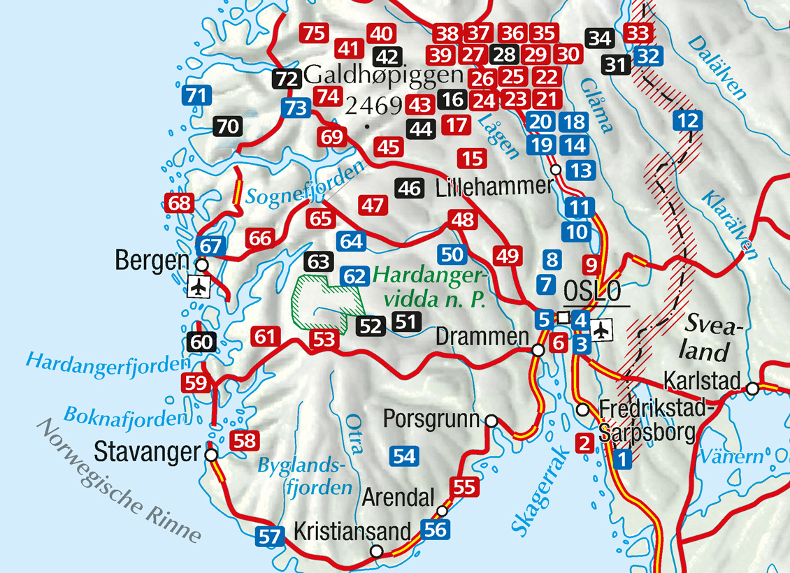 - Zahlreiche Ferienstraßen, die »Turistveger«, erschließen die großartigsten Landschaften Südnorwegens vom Hardangerfjord im Westen bis zum Rondane-Gebirge im Osten.