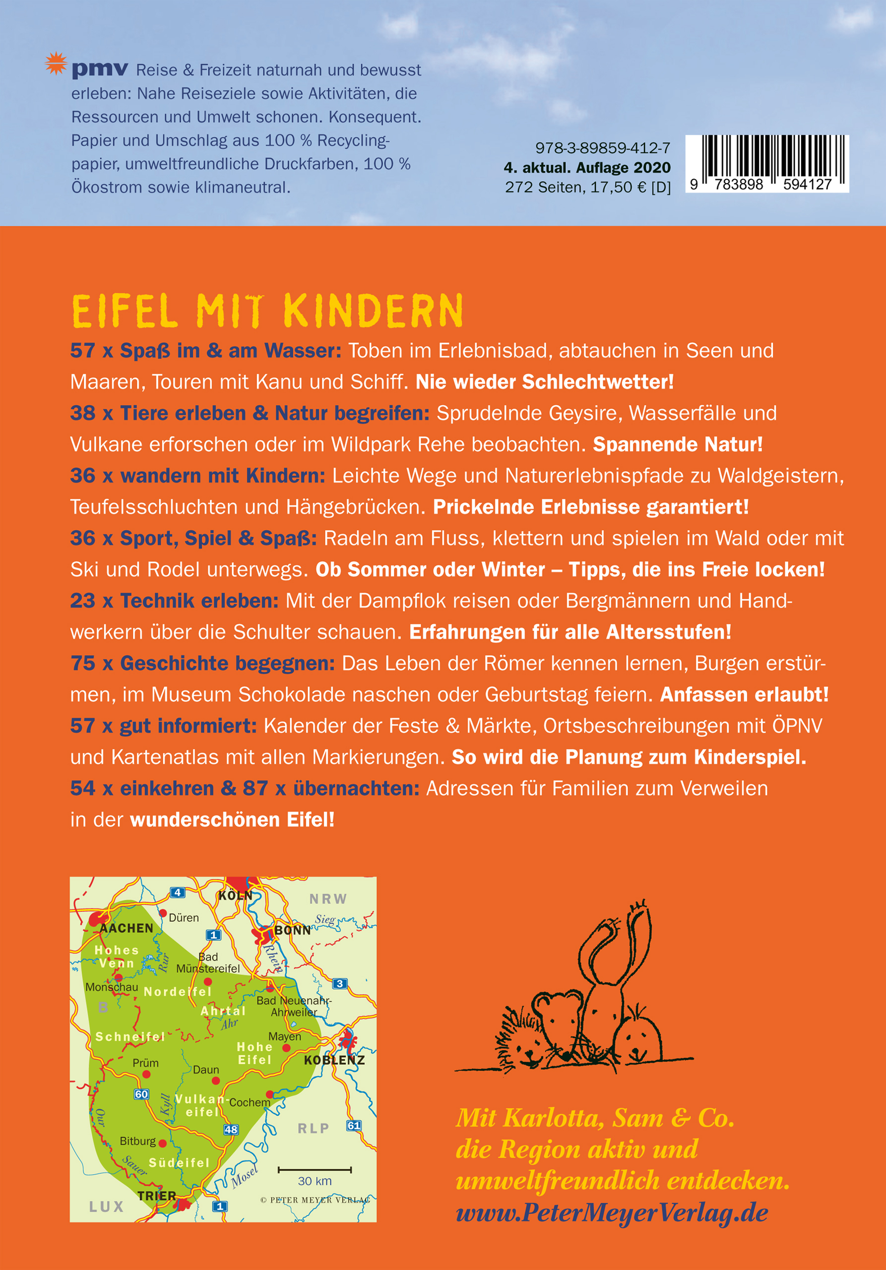 Über 300 Ausflüge und Aktivitäten von Aachen bis Trier, von Luxemburg bis zur Aar, zeigen Kindern zwischen 3 und 13 Jahre wie spannend Freizeitvergnügen in der Eifel ist. Spaß in und am Wasser, Radeln und Natur erleben, Museen, Burgen und Schlösser - Unternehmungen jeder Art und rund ums Jahr, immer persönlich recherchiert und komplett mit Anfahrt, Öffnungszeiten und Preisen.