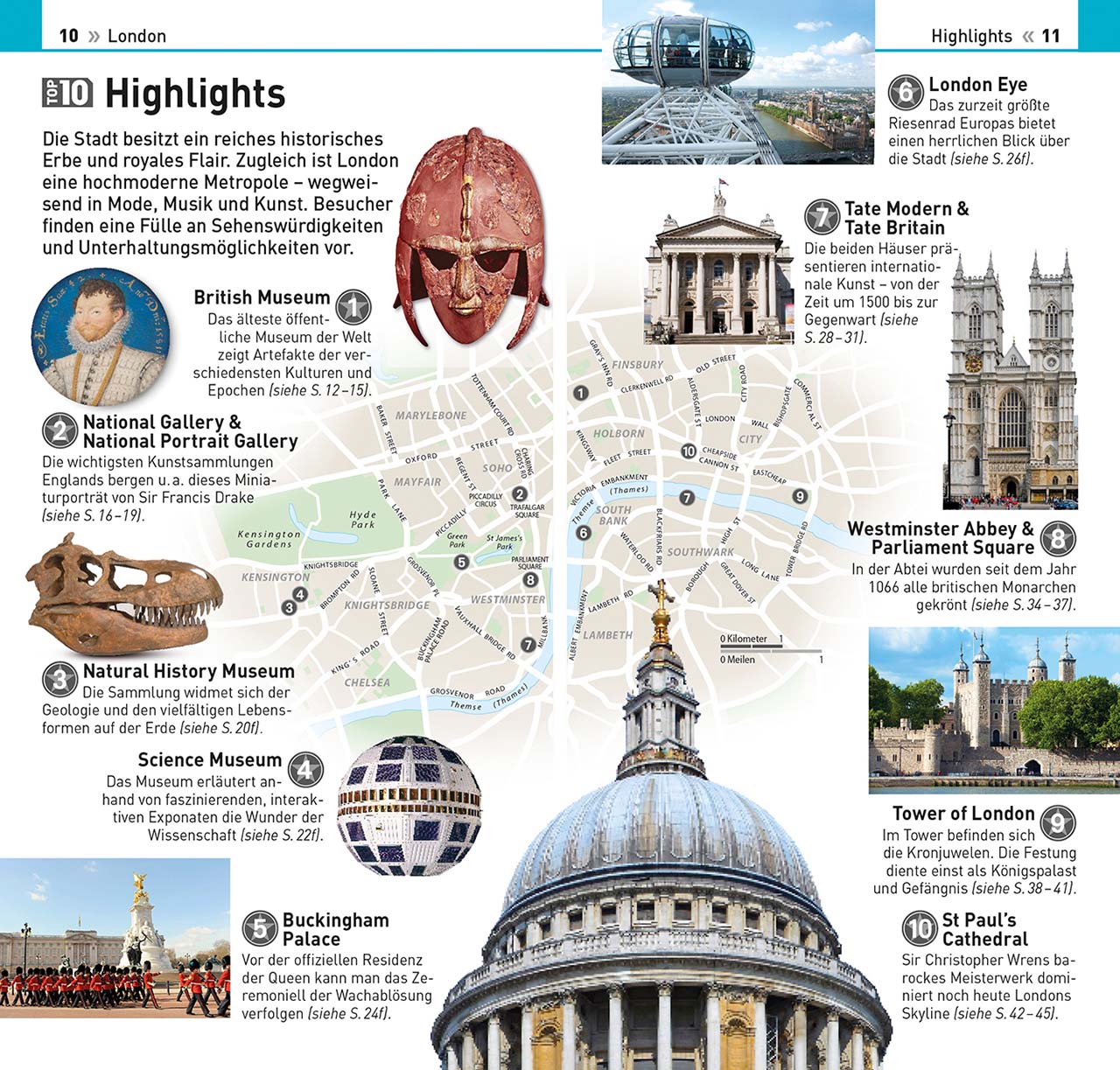 Highlights: Sie sind nur kurz in der Stadt, wollen aber nichts verpassen? Dann sind Sie in der Rubrik Londons Highlights genau richtig. Hier werden Sie auf direktem Weg zu den zehn wichtigsten Sehenswürdigkeiten der Stadt geführt, die jeweils auf einer Doppelseite ausführlich vorgestellt werden: vom British Museum, über London Eye und Buckingham Palace bis zum Tower of London. Für diejenigen unter Ihnen, die nur für zwei oder vier Tage in London sind und die Zeit optimal nutzen wollen, bieten die Tagestouren-Vorschläge eine hilfreiche Inspiration für Ihre Reiseplanung. Die Touren sind zudem auf einer übersichtlichen Karte eingezeichnet.