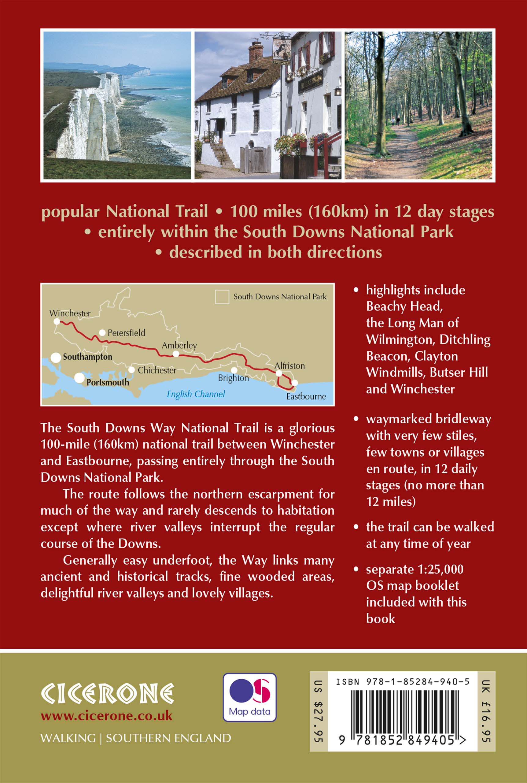 The South Downs Way National Trail is a 100 mile (160km) walk between Eastbourne and Winchester, staying within the glorious South Downs National Park for its entire length. Presented here in 12 stages of up to 12 miles (19km), the route is described in both east-west and west-east. A waymarked trail with very few stiles, it can be walked at any time of year and makes a good introduction to long-distance walking.
