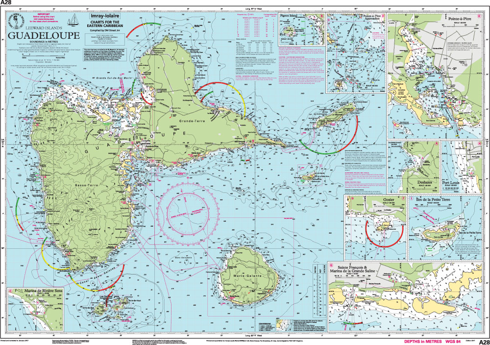 Leeward IslandsPlans included:Deshaies (1:25 000)Pigeon Island (1:25 000)Marina de Riviere Sens (1:10 000)Pointe-a-Pitre Approaches (1:50 000)Pointe-a-Pitre (1:25 000)Gosier (1:30 000)Sainte Francois & Marina de la Grande Saline (1:10 000)Port Louis (1:20 000)Iles de la Petite Terre (1:50 000)On this 2017 edition the latest information on Marine Reserves is shown. The revised buoyed approach to Pointe a Pitre is shown and a revised plan showing the new channel along with recommended tracks is included. The plan of Deshaies has been extended to show a greater approach from the south.A new plan of Pigeon Island is included, showing anchorages and the marine reserve.The chart specification has been improved to show coloured light flashes. There has been general updating throughout.