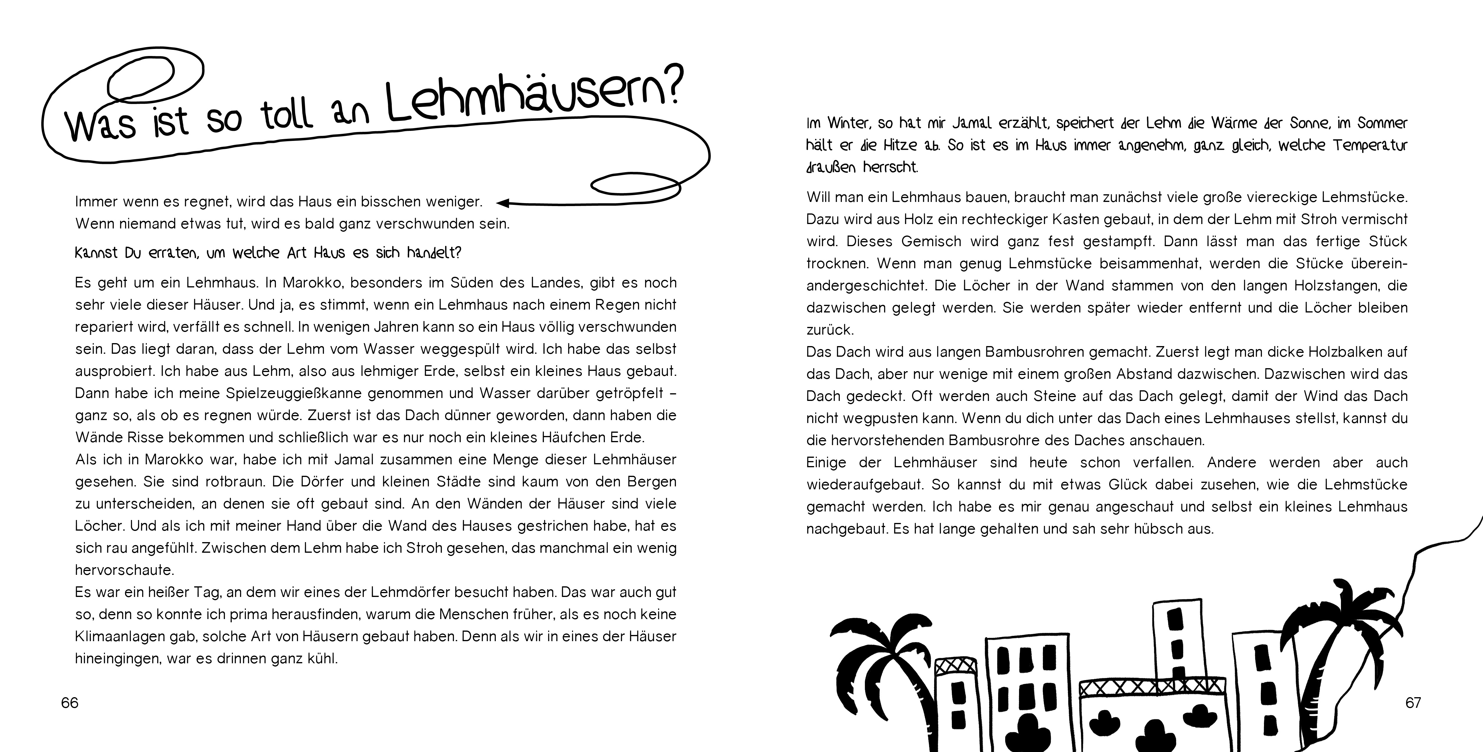 Phantastische Landschaften, köstliches Essen und diese leuchtenden Farben, Marokko ist ein traumhaft schönes Reiseland für die ganze Familie. Marokko for kids wendet sich speziell an die Kinder und beantwortet all die Fragen, die Kinder in einem Urlaub in Marokko stellen - und die den Erwachsenen vielleicht gar nicht in den Sinn kommen: Wie leben die Menschen in der Wüste? Was riecht da so lecker, etwa der spitze Hut aus Ton auf dem Tisch? Und was machen eigentlich die Ziegen auf dem Baum?