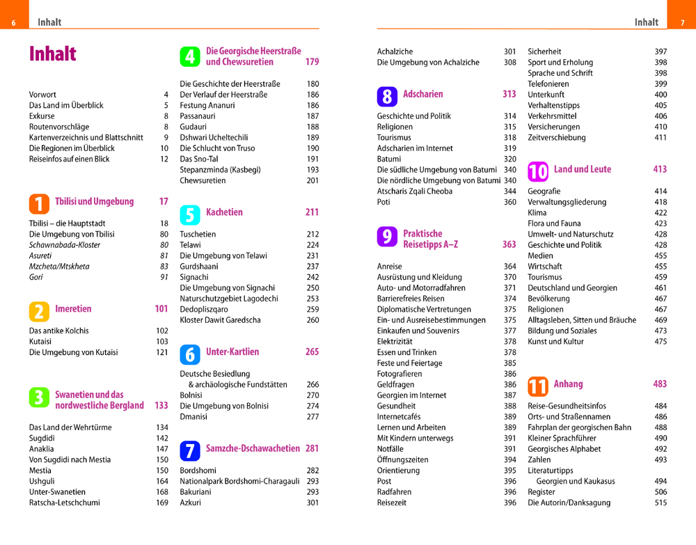 Inhalt:Vorwort 4Das Land im Überblick 5Exkurse 8Routenvorschläge 8Kartenverzeichnis und Blattschnitt 9Die Regionen im Überblick 10Reiseinfos auf einen Blick 12Tbilisi und Umgebung 17Tbilisi - die Hauptstadt 18Die Umgebung von Tbilisi 80Schawnabada-Kloster 80Asureti 81Mzcheta/Mtskheta 83Gori 91Imeretien 101Das antike Kolchis 102Kutaisi 103Die Umgebung von Kutaisi 121Swanetien und das nordwestliche Bergland 133Das Land der Wehrtürme 134Sugdidi 142Anaklia 147Von Sugdidi nach Mestia 150Mestia 150Ushguli 164Unter-Swanetien 168Ratscha-Letschchumi 169Die Georgische Heerstraße und Chewsuretien 179Die Geschichte der Heerstraße 180Der Verlauf der Heerstraße 186Festung Ananuri 186Passanauri 187Gudauri 188Dshwari Ucheltechili 189Die Schlucht von Truso 190Das Sno-Tal 191Stepanzminda (Kasbegi) 193Chewsuretien 201Kachetien 211Tuschetien 212Telawi 224Die Umgebung von Telawi 231Gurdshaani 237Signachi 242Die Umgebung von Signachi 250Naturschutzgebiet Lagodechi 253Dedopliszqaro 259Kloster Dawit Garedscha 260Unter-Kartlien 265Deutsche Besiedlung & archäologische Fundstätten 266Bolnisi 270Die Umgebung von Bolnisi 274Dmanisi 277Samzche-Dschawachetien 281Bordshomi 282Nationalpark Bordshomi-Charagauli 293Bakuriani 293Azkuri 301Achalziche 301Die Umgebung von Achalziche 308Adscharien 313Geschichte und Politik 314Religionen 315Tourismus 318Adscharien im Internet 319Batumi 320Die südliche Umgebung von Batumi 340Die nördliche Umgebung von Batumi 340Atscharis Zqali Cheoba 344Poti 360Praktische Reisetipps A-Z 363Anreise 364Ausrüstung und Kleidung 370Auto- und Motorradfahren 371Barrierefreies Reisen 374Diplomatische Vertretungen 375Ein- und Ausreisebestimmungen 375Einkaufen und Souvenirs 377Elektrizität 378Essen und Trinken 378Feste und Feiertage 385Fotografieren 386Geldfragen 386Georgien im Internet 387Gesundheit 388Internetcafés 389Lernen und Arbeiten 389Mit Kindern unterwegs 391Notfälle 391Öffnungszeiten 394Orientierung 395Post 396Radfahren 396Reisezeit 396Sicherheit 397Sport und Erholung 398Sprache und Schrift 398Telefonieren 399Unterkunft 400Verhaltenstipps 405Verkehrsmittel 406Versicherungen 410Zeitverschiebung 411Land und Leute 413Geografie 414Verwaltungsgliederung 418Klima 422Flora und Fauna 423Umwelt- und Naturschutz 428Geschichte und Politik 428Medien 455Wirtschaft 455Tourismus 459Deutschland und Georgien 461Bevölkerung 467Religionen 467Alltagsleben, Sitten und Bräuche 469Bildung und Soziales 473Kunst und Kultur 475Anhang 483Reise-Gesundheitsinfos 484Orts- und Straßennamen 486Fahrplan der georgischen Bahn 488Kleiner Sprachführer 490Georgisches Alphabet 492Zahlen 493Literaturtipps Georgien und Kaukasus 494Register 506Die Autorin 515