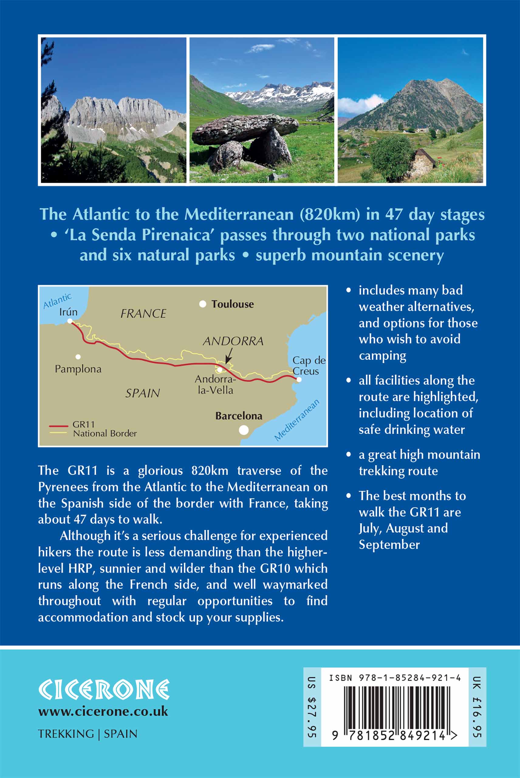 The GR11 trail (La Senda Pirenaica) is a glorious 820km traverse of the Pyrenees from the Atlantic to the Mediterranean on the Spanish side of the border with France.