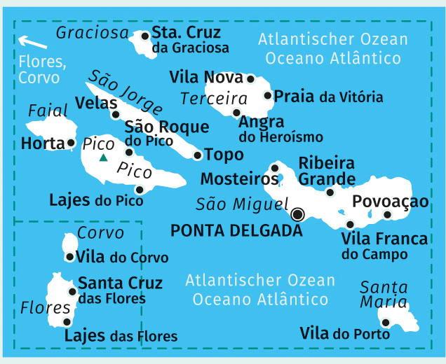 - Der Archipel besteht aus drei Inselgruppen - die östliche Gruppe mit Sao Miguel und Santa Maria, die zentrale Gruppe mit Terceira, Sao Jorge, Graciosa, Pico und Faial. Die Westgruppe mit den Inseln Flores und Corvo, Hauptstadt der Azoren ist Ponta Delgada auf Sao Miguel.