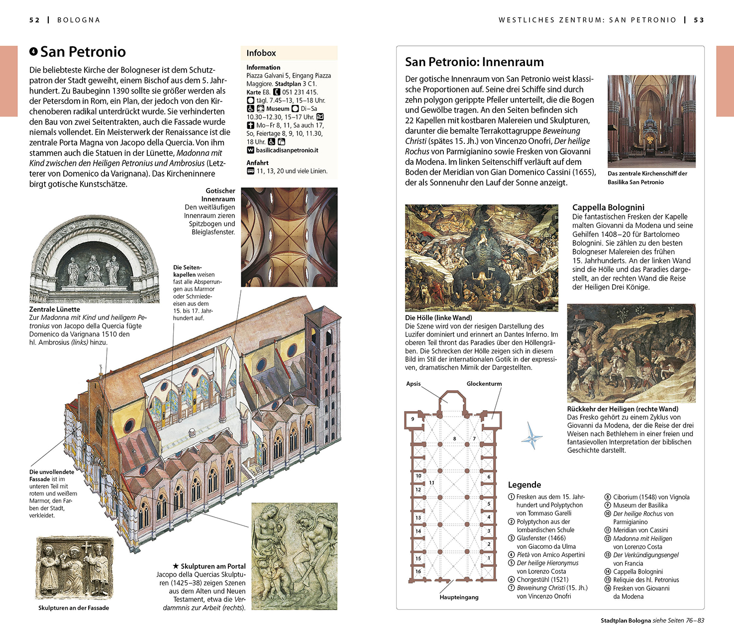 -3D-Aufrisszeichungen vom Piazza Maggiore oder der Pinacoteca Nazionale sowie über 700 hochwertige Farbfotografien von der Kuppel der Kirche San Domenico oder den Geschlechtertürmen in Bolognas Altstadt bieten spannende Einblicke in Land, Leute und die wichtigsten Sehenswürdigkeiten.