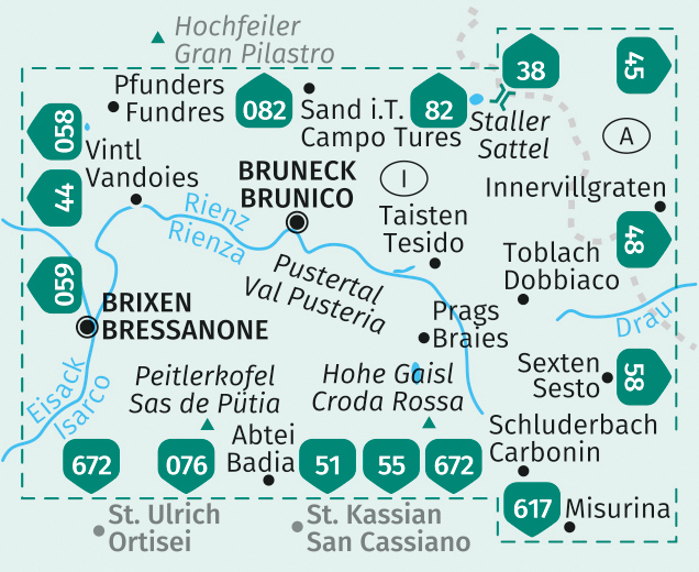 - Hauptort ist Bruneck, nach Norden zweigen das Tauferer und das Ahrntal mit ihren Seitentälern ab. Nach Süden das Pragser Tal mit dem bekannten Pragser Wildsee, das Sextnertal und das Höhlensteintal.