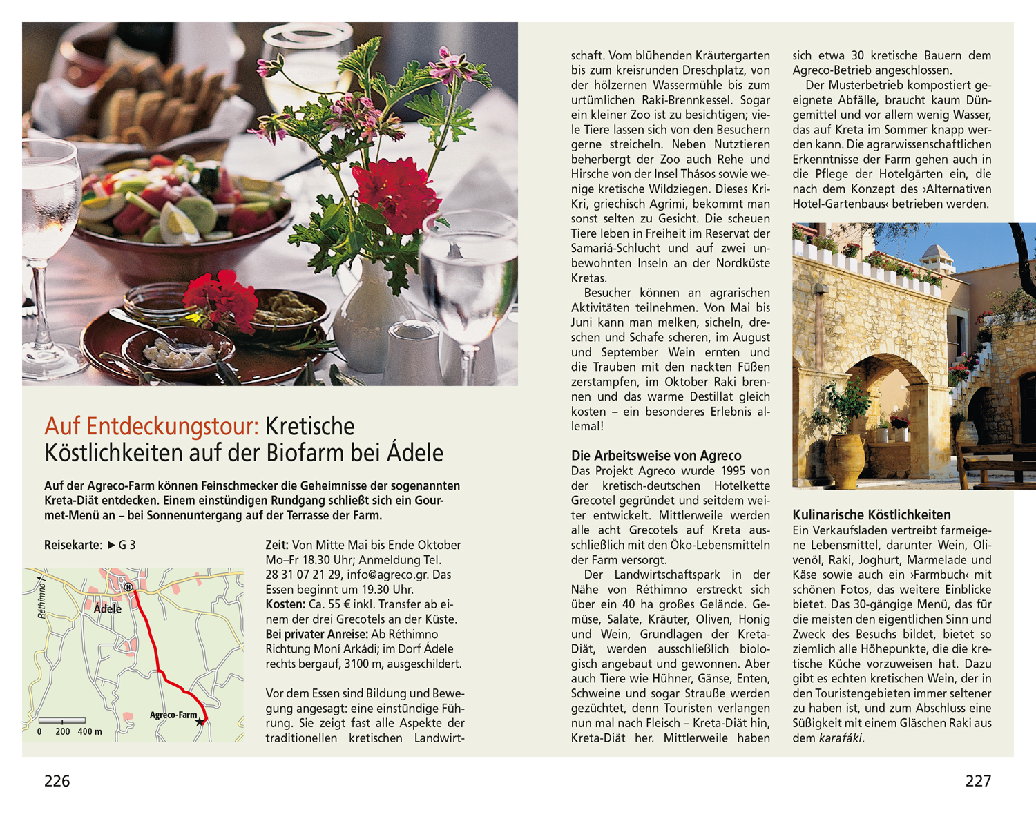 Überhaupt gibt es auf Kreta abseits der Hotelkomplexe an der Nordküste noch viele wenig bekannte Ecken. Und so führt das Reise-Taschenbuch in die kleinen Orte im Süden der Insel mit ihren feinen Stränden und ihrem gemütlichen Nachtleben oder in die stillen Bergdörfer im Reich der Ziegen und Schafe, wo das Leben seit Jahrhunderten seinen gewohnten Gang geht.