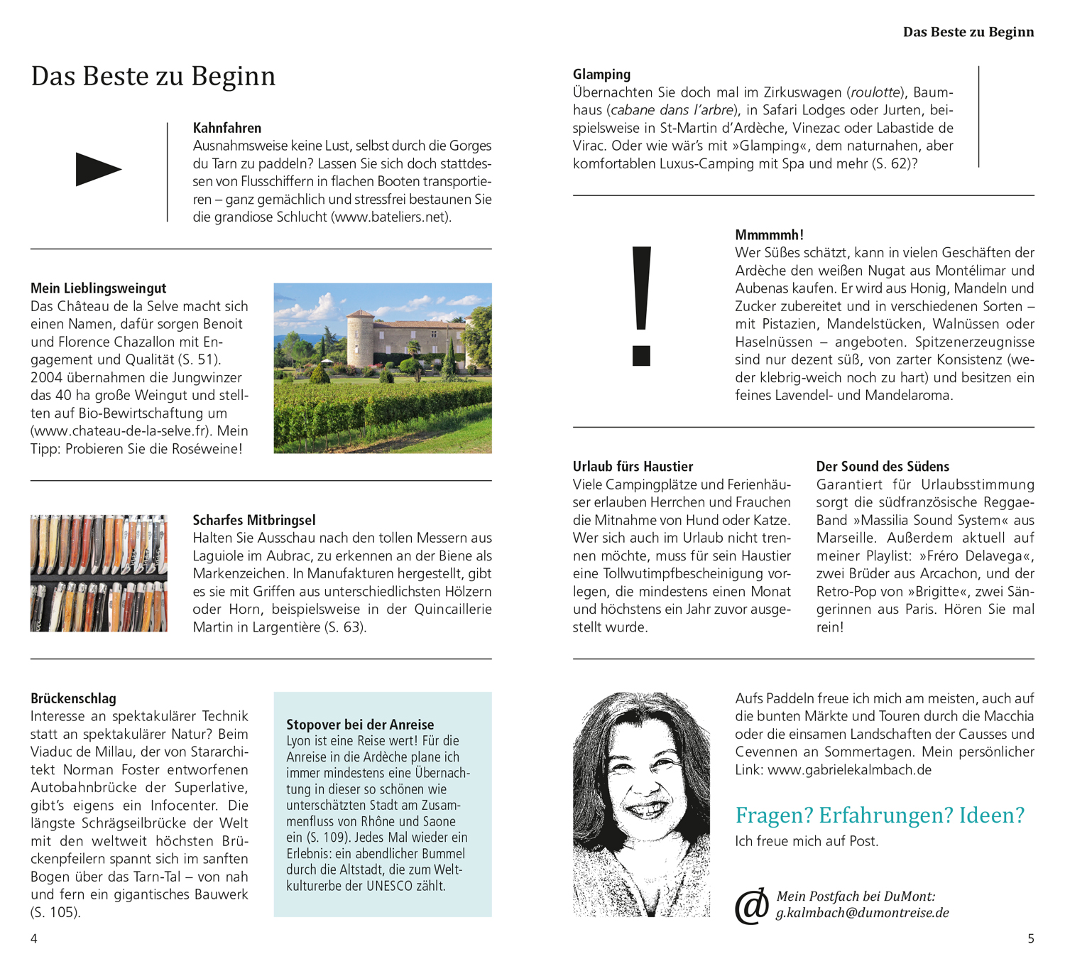 Gabriele Kalmbach geht bevorzugt zum Wandern und Kajakfahren in die urwüchsige Landschaft der Cevennen, an Tarn und Ardèche. Neben den fantastischen Flüssen und tiefen Schluchten der Region sind es auch die endlosen Kastanienwälder und die einsamen Hochebenen sowie die schmackhafte regionale Küche, die sie besonders reizvoll findet.
