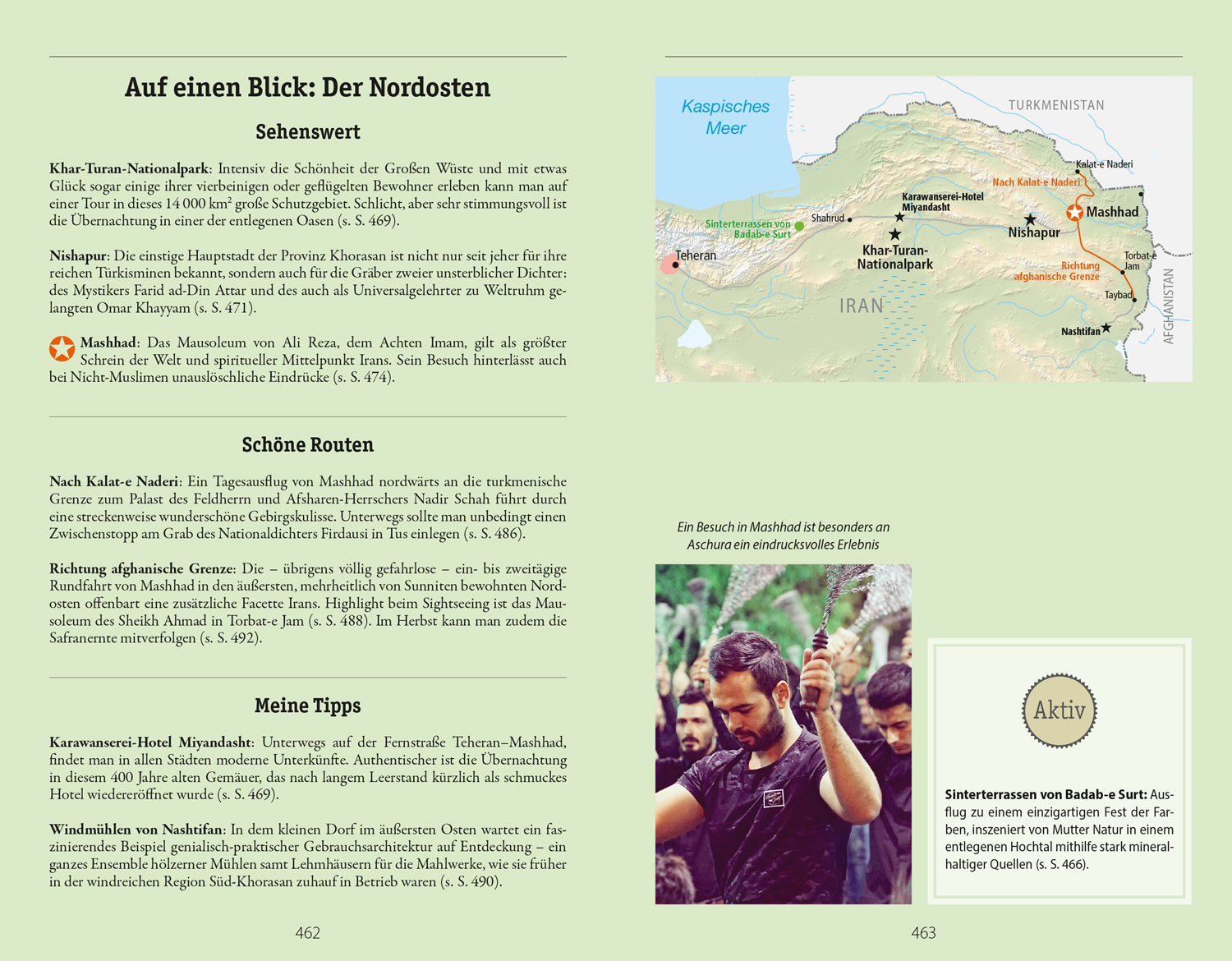 Für eine rasche Orientierung sorgen die detaillierte Extra-Reisekarte im Maßstab 1:1.800.000, eine Übersichtskarte mit den Highlights sowie mehr als zwei Dutzend Citypläne, Wander- und Routenkarten. Zusätzlich sehr hilfreich, um sich vor Ort zurechtzufinden, sind die aberhunderten eigens ins Persisch übersetzte und im Text in persischer Schrift eingeklinkten Ortsbezeichnungen.