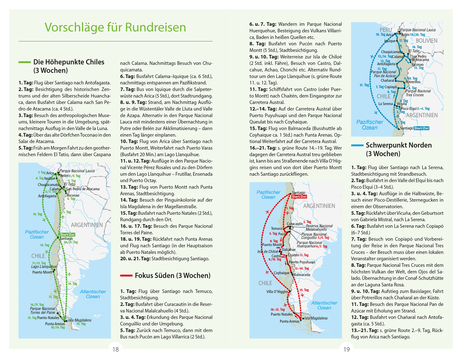 Wissenswertes über Chile und die Osterinsel, Wissenswertes für die Reise, Kulinarisches Lexikon, Sprachführer, Santiago und die Zentralküste, Kleiner Süden und Isla de Chiloé, Carretera Austral, Magallanes und Feuerland, Kleiner Norden mit La Serena und Copiapó, Großer Norden mit San Pedro de Atacama, Osterinsel und Juan-Fernández- Inseln, 46 Karten und Pläne plus eine separate Reisekarte zu Chile und die Osterinsel im Maßstab 1:1.800.000.