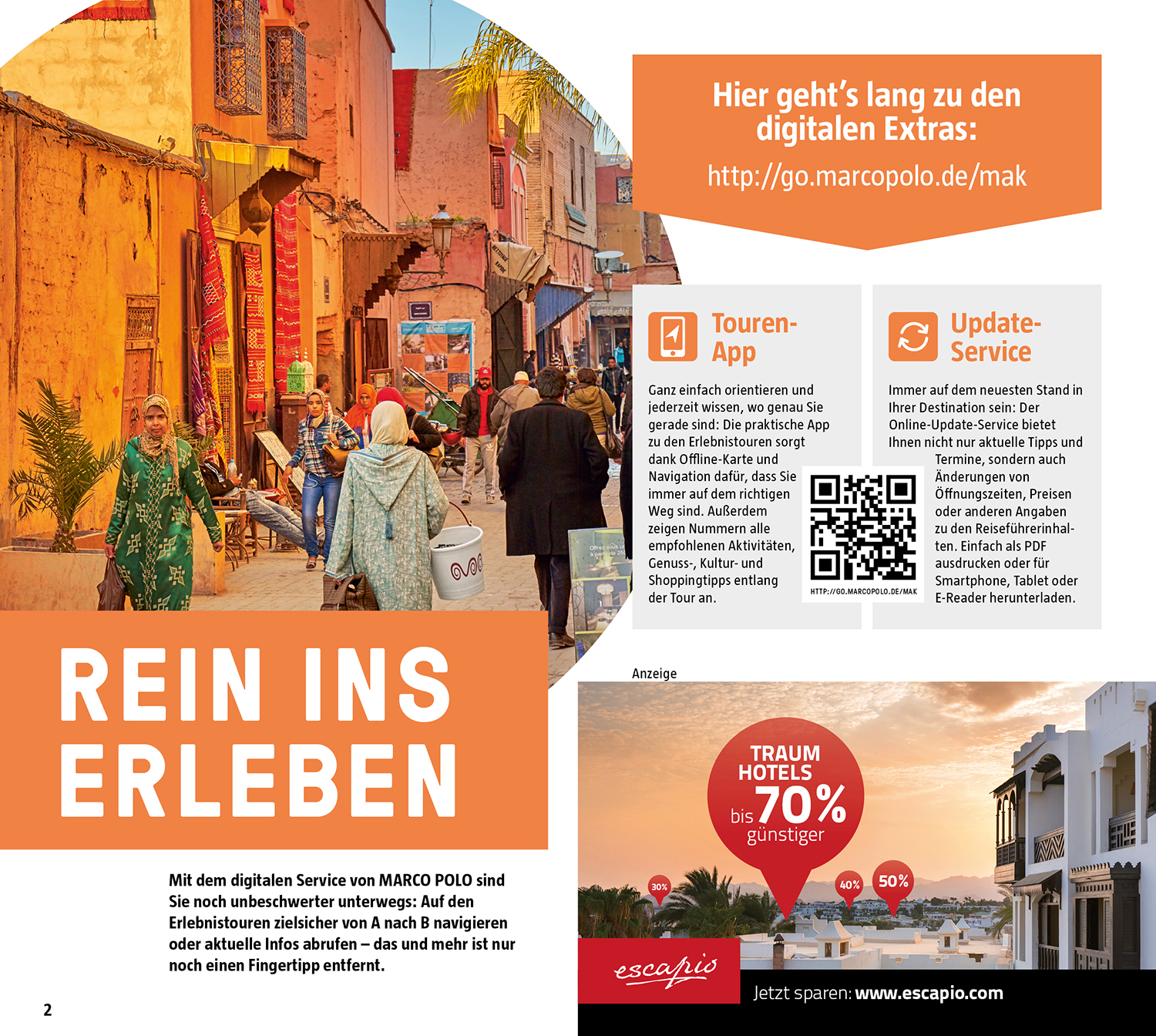 Erleben Sie mit MARCO POLO die marokkanische Trendmetropole intensiv vom Frühstück bis zum Nightcap. Mit dem MARCO POLO Reiseführer kommen Sie sofort in Marrakesch an und wissen garantiert, „wohin zuerst“. Erfahren Sie, welche Highlights Sie neben dem Djemaa el Fna und den Souks nicht verpassen dürfen, auf welcher Dachterrasse mit Blick auf die Medina der Absacker zu marokkanischen Tapas besonders gut schmeckt, in welcher Szenebar der Marock ‘n‘ Roll am heißesten groovt, auf welchem Flohmarkt Sie supergünstig Teegeschirr erstehen können und in welchen Riads sich Ihr Traum aus 1001 Nacht erfüllt.