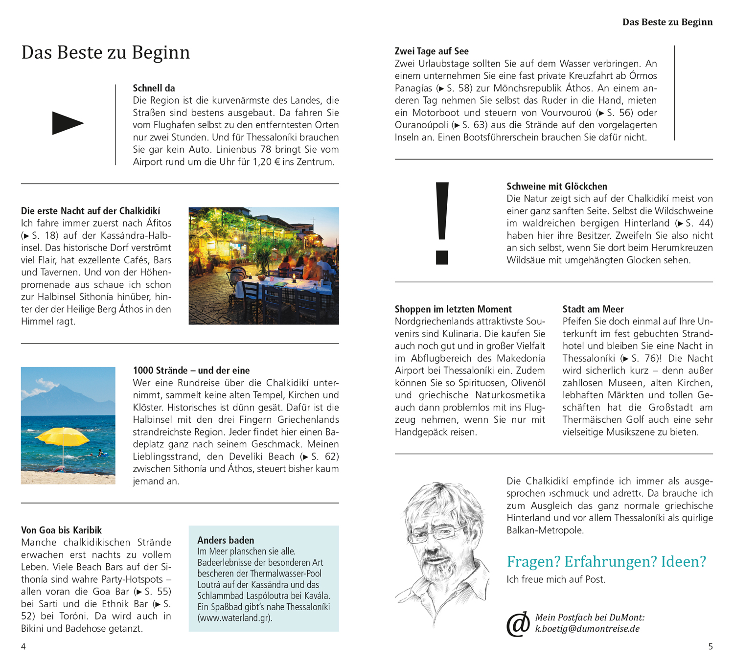 Der Bremer Reisejournalist Klaus Bötig kennt Griechenland seit 1972 und ist seitdem jedes Jahr zu jeder Jahreszeit im Land unterwegs. Thessaloníki hält er wegen seiner grandiosen Lage direkt am Meer, seiner Märkte und Museen, seines großen kulturellen Angebots, seiner Vielfalt an Cafés und Tavernen für ein ideales Städtereiseziel. Für ihn steht auch fest: mehr erstklassige Strände als die Chalkidikí besitzt keine andere Region des Landes.
