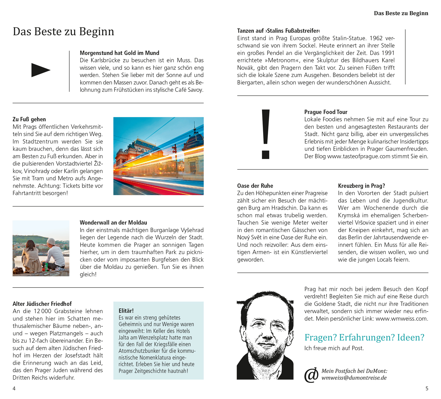 Das Beste zu Beginn. Das ist Prag. Prag in Zahlen. Was ist wo? Augenblicke. Ihr Prag-Kompass: 15 Direktkapitel. Prager Museumslandschaft. Erinnerungsorte der Zeitgeschichte. Literarische Reise durch Prag. Agent Provocateur: David Cerný. Pause, einfach mal abschalten. In fremden Betten. Satt & glücklich. Stöbern & entdecken. Wenn die Nacht beginnt. Hin & weg. O- Ton Prag. Kennen Sie die?