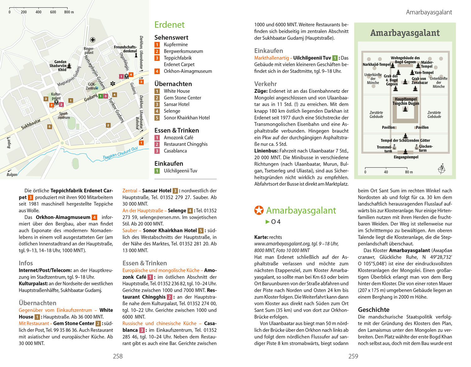 Wissenswertes über die Mongolei, Wissenswertes für die Reise, Kulinarisches Lexikon, Sprachführer, Ulaanbaatar und Umgebung, zentrale und nördliche Mongolei, Süden und Ost-Khangai, Westen und Altai-Gebirge, Osten und Steppen-Aimags, 24 Karten und Pläne plus eine separate Mongolei-Reisekarte im Maßstab 1:2.000.000.