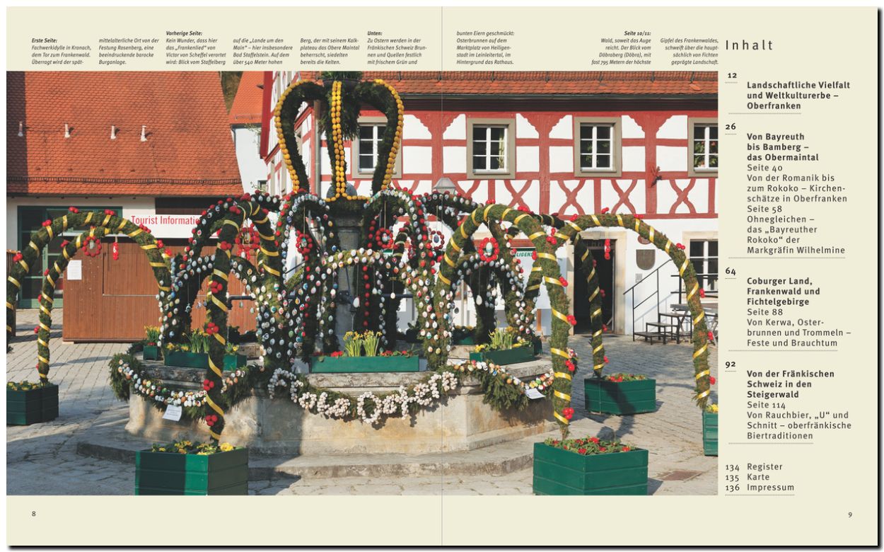 Rund 200 Bilder zeigen alle Facetten der oberfränkischen Landschaft. Vier Specials berichten über die vielfältige Brauereienlandschaft, über die Markgräfin Wilhelmine von Bayreuth, über Feste und Brauchtum sowie über bedeutende Kirchenbauten - allen voran der Bamberger Dom.