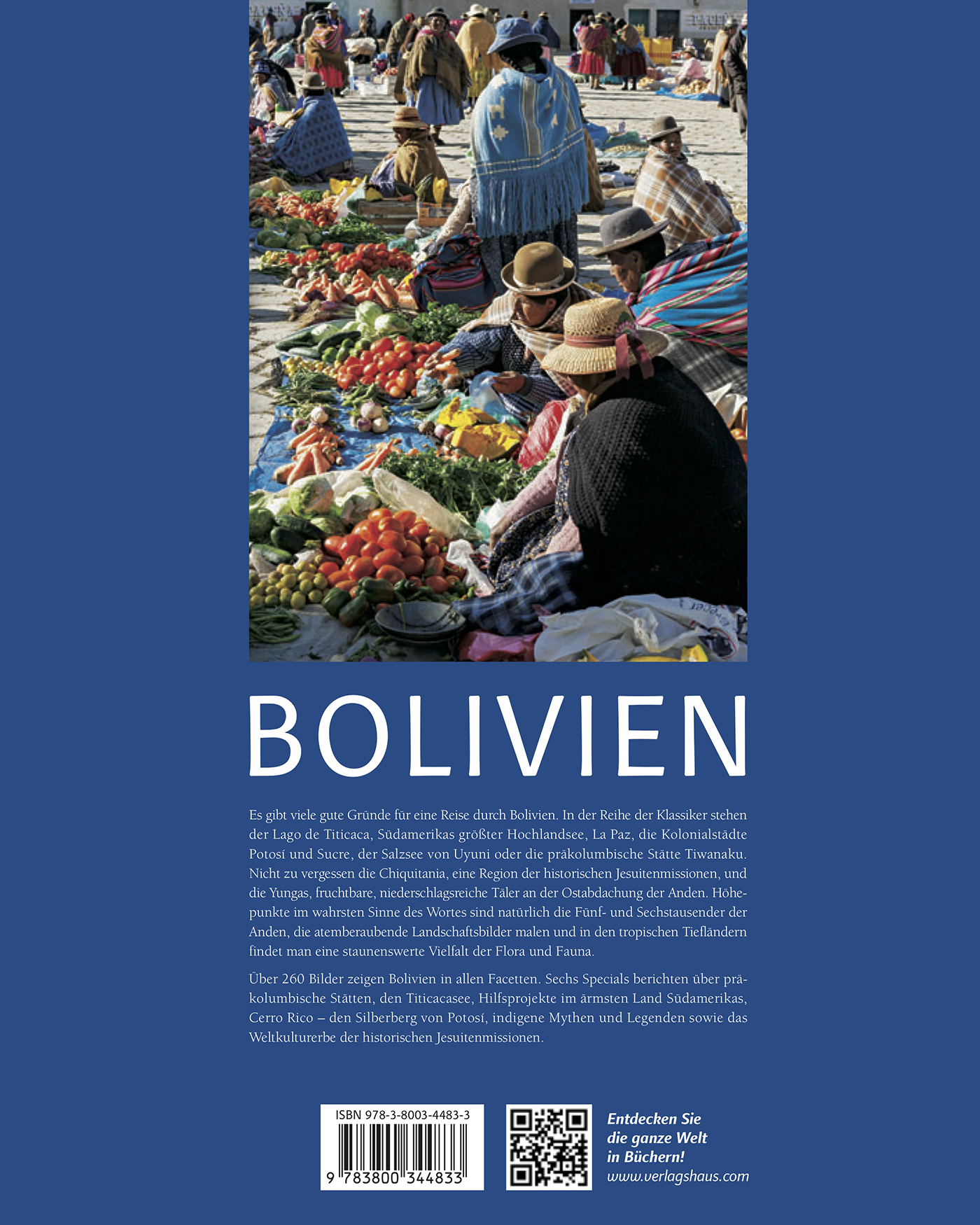 | Schlagworte | Bildband • Bolivien • Bolivien; Bildband • Brasilien • Chile • Cochabamba • La Paz • Orte und Menschen: Sachbuch, Bildbände • Parque Nacional Amboró • Parque Nacional Carrasco • Parque Nacional Isiboro Sécure • Parque Nacional Kaa-lya del Gran Chaco • Parque Nacional Madidi • Parque Nacional Noel Kempff Mercado • Parque Nacional Sajama • Parque Nacional Torotoro • Potosí • Reisebildband • Reserva National de Fauna Andina Eduardo Avaroa • Santa Cruz • Santa Rosa • Sucre • Südamerika • Tarija • Trinidad |