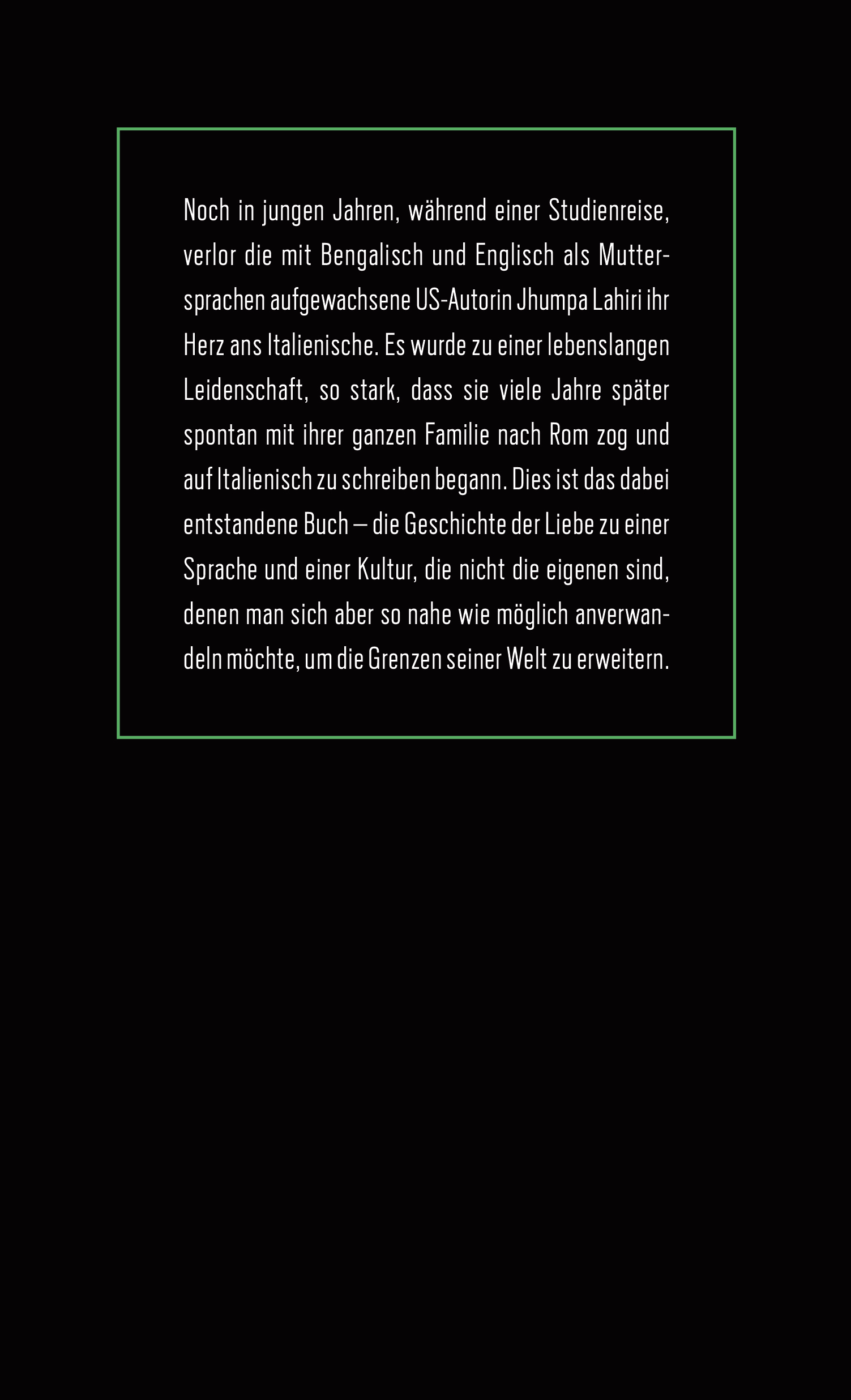 Dies ist ein sehr persönliches Buch, die präzise Auseinandersetzung einer Schriftstellerin mit einer Fremdsprache, die langsam zur eigenen Sprache wird, und mit einem Land, das ihre neue Heimat werden soll. Italien! Rom! Die Geschichte! Die Lebensart! Zugleich berührt es große Fragen: Heimat, Identität, was ist das überhaupt, woraus entsteht es? Lahiri tauchte so tief in die Fremdheit der neuen Sprache und Kultur ein, bis sie in der Lage war, ihr erstes Buch auf Italienisch zu schreiben.