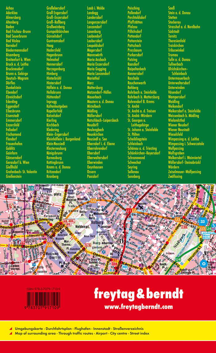 freytag & berndt Stadtpläne sind für viele internationale Hauptstädte sowie zahlreiche Städte und Orte im In- und Ausland erhältlich. Mit den handlichen Faltplänen und praktischen Buchplänen findet man sich dank der genauen Maßstäbe und des übersichtlichen Kartenbilds überall gut zurecht. Der Städteatlas "Großraum Wien 1:15.000" ist in Extra großer Schrift gedruckt und bietet zahlreiche Zusatzinformationen wie einen U-Bahn-Plan, Innenstadt-Plan, öffentliche Verkehrsmittel und Sehenswürdigkeiten. Im umfangreichen Index finden Sie außerdem jede Adresse. Alle Inhalte werden natürlich regelmäßig aktualisiert. Großformat A4, Einbahnen, Kurzparkzonen, Innenstadtplan, Straßenverzeichnis, Firmenstandorte, Sehenswürdigkeiten, Öffentliche Verkehrsmittel, Flughafen Wien, Durchfahrtsplan, Autokarte Großraum Wien 1:225.000;