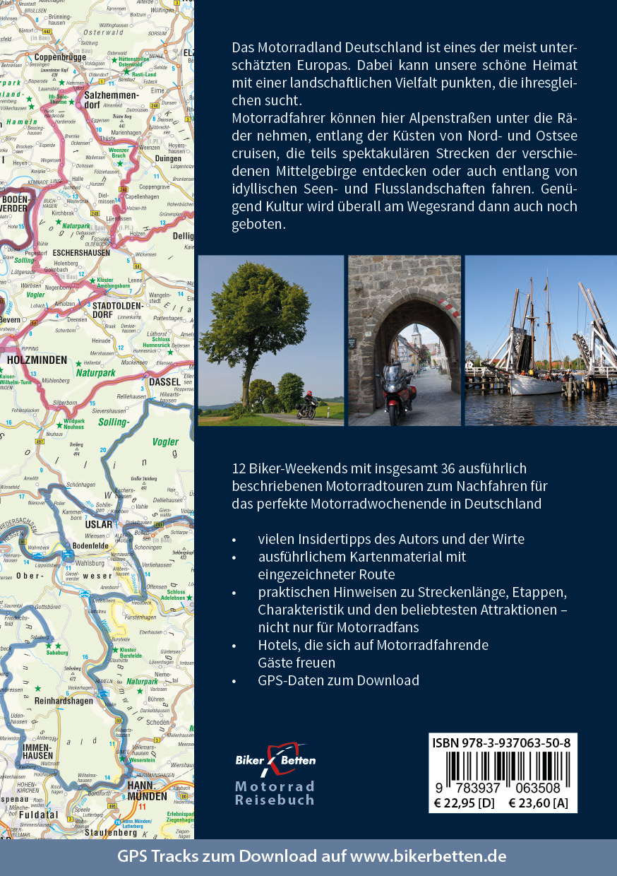 BIKER WEEKENDS DEUTSCHLANDDas Motorradland Deutschland ist eines der meist unterschätzten Europas. Dabei kann unsere schöne Heimat mit einer landschaftlichen Vielfalt punkten, die ihresgleichen sucht. Motorradfahrer können hier Alpenstraßen unter die Räder nehmen, entlang der Küsten von Nord- und Ostsee cruisen, die teils spektakulären Strecken der verschiedenen Mittelgebirge entdecken oder auch entlang von idyllischen Seen- und Flusslandschaften fahren. Genügend Kultur wird überall am Wegesrand dann auch noch geboten.12 Bikerweekends mit insgesamt 36 ausführlich beschriebenen Motorradtouren zum Nachfahren für das perfekte Motorradwochenende in Deutschland- vielen Insidertipps des Autoren- ausführlichem Kartenmaterial mit eingezeichneter Route- praktischen Hinweisen zu Streckenlänge, Etappen, Charakteristik und den beliebtesten Attraktionen - nicht nur für Motorradfans- Hotels, die sich auf Motorradfahrende Gäste freuen und dessen Wirte selber fahren- GPS-Daten zum Download.
