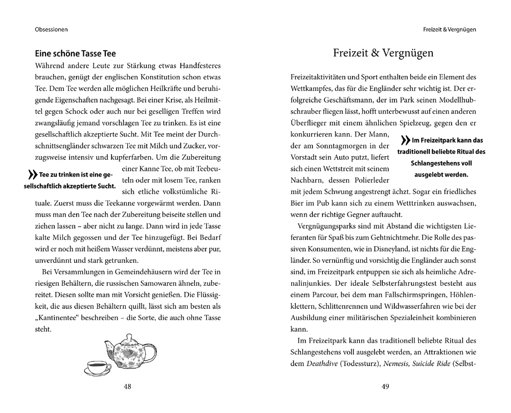 "Auf 108 Seiten bringen die lockeren, teils bissigen Texte das Engländersein auf den Punkt. [...] Nice!" abenteuer & reisen "Das Buch ist so lustig geschrieben, dass ich es nach kürzester Zeit durchgelesen hatte und dabei einige Male sehr lachen musste." Immerglueck.com "Die Kurztexte sind so amüsant, dass man sich vor dem nächsten Fettnäpfchen sicher daran erinnert. [...] Beitrag zur interkulturellen Kommunikation ..." Münchner Merkur "Die Reihe begegnet den kulturellen Unterschieden offen. Im lockeren, mitunter bissigen Stil bleiben die Texte immer feinsinnig und auf den Punkt. Altmark-Zeitung "Empfehlenswert für alle, die sich mit einem Augenzwinkern über die wissens- und liebenswerten Eigenheiten anderer Länder informieren wollen." Nordis. Das Nordeuropamagazin "Länder mal nicht anhand ihrer Sehenswürdigkeiten, sondern ihrer Eigenarten und Einwohner kennenlernen." BILD "Das ist nicht nur amüsant zu lesen, sondern für Reisen tatsächlich hilfreich. Um nicht ins Fettnäpfchen zu treten oder gar bis über beide Ohren darin zu versinken." Badische Zeitung