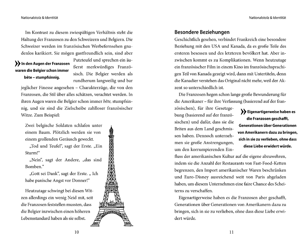 Die Fremdenversteher über die Franzosen: „Die Franzosen mögen es, wenn sich die Regierung in ihr Leben einmischt. [...] Der Staat ist Frankreich - wie Kochen, Wein, Frauen, das Land, Paris, Kultur, Kinder, Freiheit-Gleichheit-Brüderlichkeit und ihr angeborenes Recht, auf dem Zebrastreifen zu parken.“