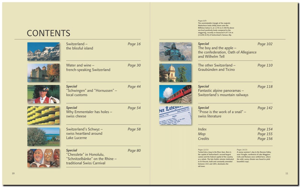 258 Bilder zeigen die Schweiz in ihrer Vielfalt, sechs Specials berichten über traditionelle Bräuche, das Rätsel der Löcher im Käse, die Schweizer Fasnacht und den Rütlischwur, sowie die Schweizer Bergbahnen und Schriftsteller des Landes.