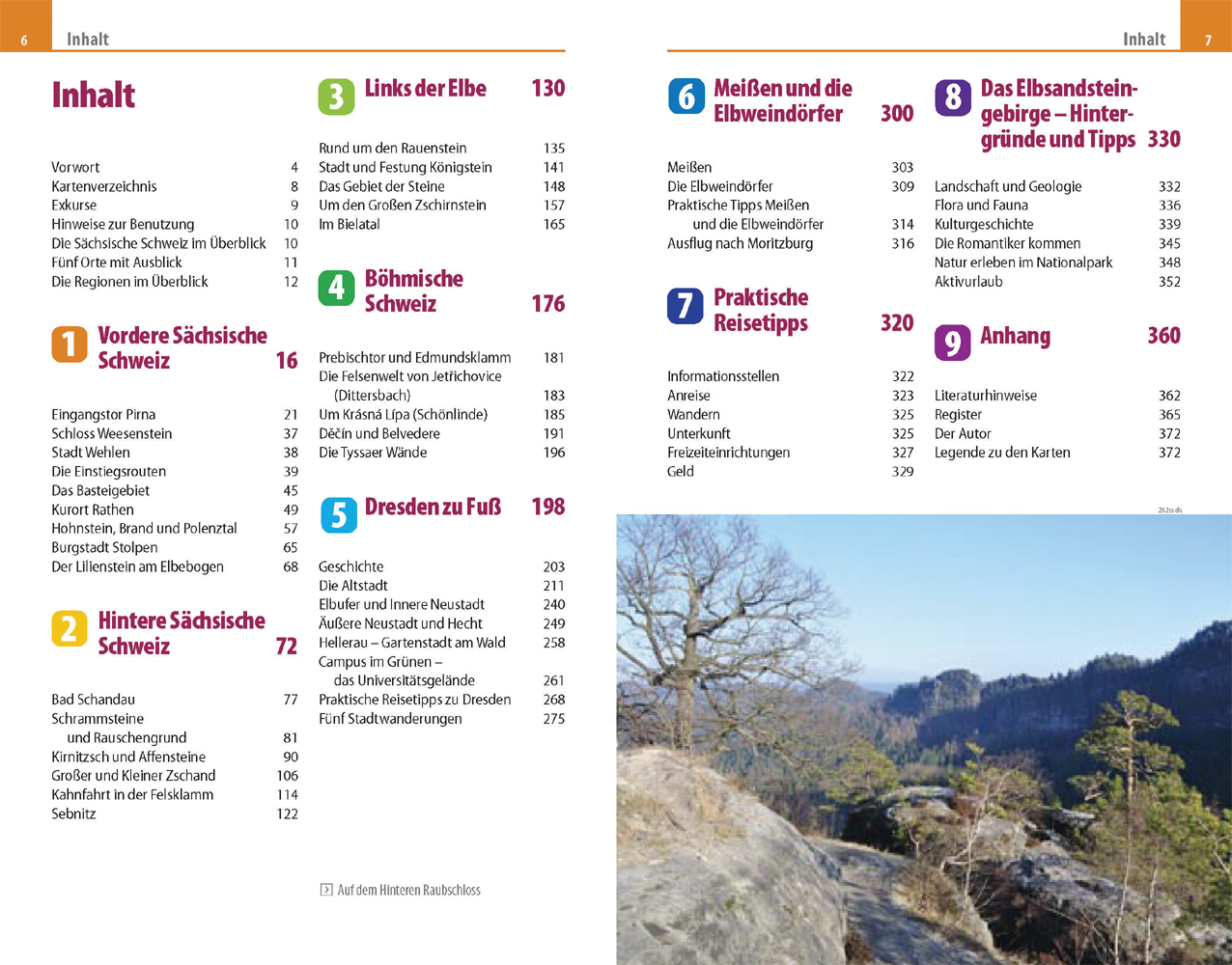 Mehr als 1200 Kilometer markierte Wanderwege und zahlreiche Kur- und Ferienorte erwarten die Besucher. Folgen Sie dem Autor zur Einsamkeit der Affensteine, auf den Gratweg über die Schrammsteine oder per Kahn durch die moosdunkle Klamm der Kirnitzsch. Entdecken Sie die Böhmische Schweiz jenseits der tschechischen Grenze, die mit der Sächsischen Schweiz eine naturräumliche Einheit bildet. Besuchen Sie die Museen, Galerien, Boulevards, Kneipen und Cafés Dresdens und genießen Sie einen Abstecher nach Meißen und Moritzburg sowie in die Elbweindörfer.