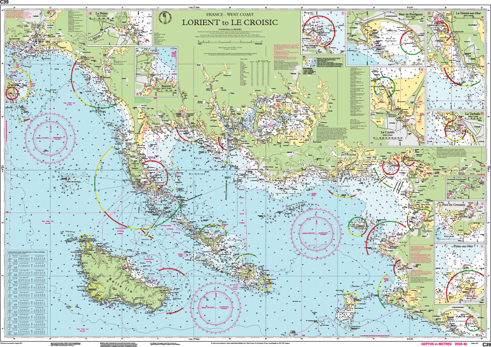 On this 2017 edition the latest depths have been included where available. The chart has fully updated firing practice areas and the harbour developments at La Turballe are included. The chart specification has been improved to show coloured light flashes. There has been general updating throughout.
