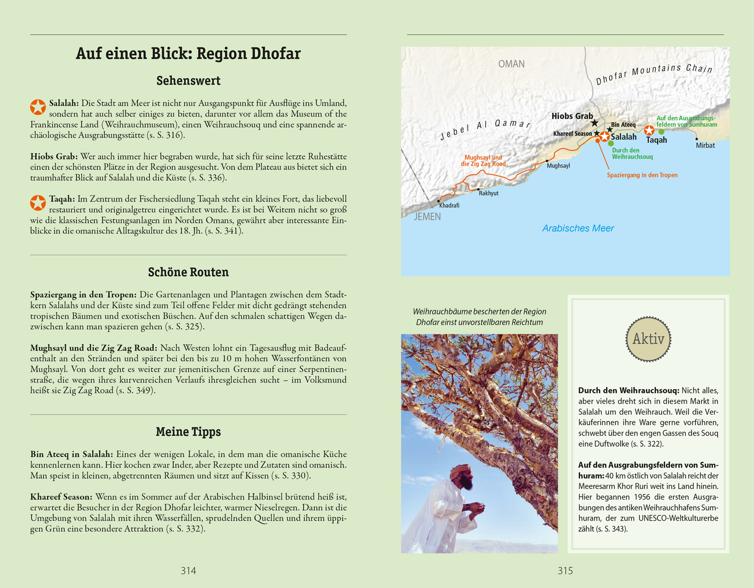 Die exotischen Geschichten, die wir von Erzählungen aus Tausendundeiner Nacht kennen, haben ihren Ursprung im südarabischen Oman, denn von hier brach Sindbad der Seefahrer zu seinen Reisen auf. Besuchern präsentiert sich Oman wie ein Stück Arabien aus dem Bilderbuch. Von Muscat mit seiner historischen Altstadt über die Buchten und Fjorde Musandams bis zur Wahibawüste werden alle sehenswerten Regionen und Städte beschrieben. Zu jedem Kapitel präsentiert eine Doppelseite "Auf einen Blick" die Highlights, die schönsten Routen, aktive Naturerlebnisse und besondere Tipps des Autors. Ort für Ort hat Gerhard Heck ausgesuchte Unterkünfte, Restaurants oder Einkaufsadressen zusammengestellt, die in den Cityplänen eingezeichnet sind. Wanderungen und Spaziergänge erschließen die schönsten Landschaften und Orte, etwa die Tropfsteinhöhlen von Al Hoota oder den Weihrauchsouq von Salalah. Viel Wissenswertes über Oman, über die Geschichte und Gegenwart oder den Alltag der Menschen, lässt sich in der einführenden Landeskunde wie in den eingestreuten Themenseiten nachlesen.