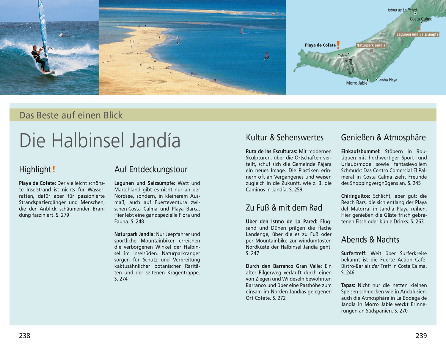 Fuerteventura persönlich. Reiseinfos, Adressen, Websites. Magazinteil (Panorama) mit Daten, Essays, Hintergründen. Der Norden. Puerto del Rosario und die Inselmitte. Das westliche Bergland. Die Ost- und Südostküste. Die Halbinsel Jandía. Sprachführer, Kulinarisches Lexikon. 33 Karten und Pläne plus eine separate Reisekarte im Maßstab 1:160.000.