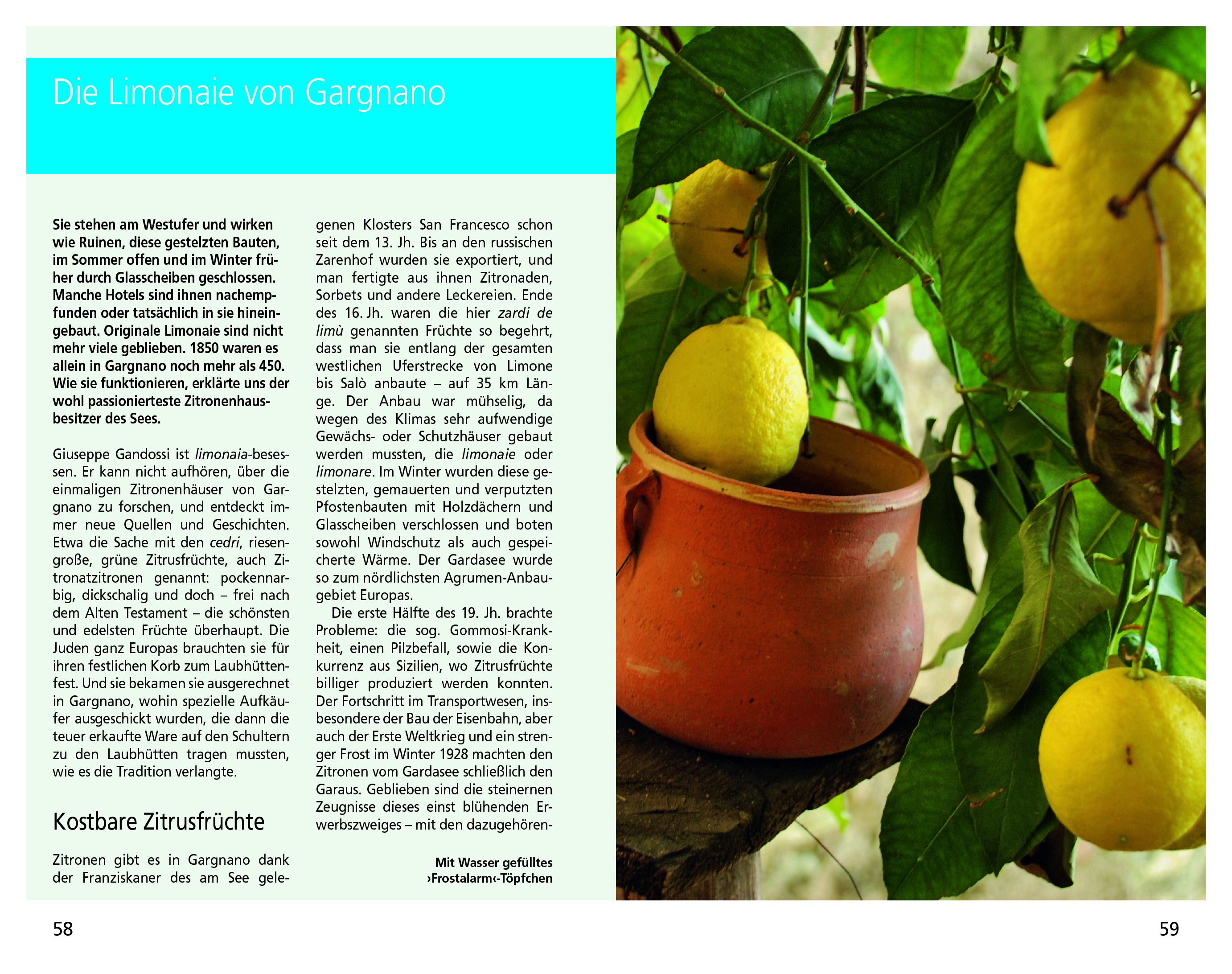 Übersichtlich präsentiert die Autorin gleich auf den ersten Seiten, welche Sehenswürdigkeiten auf dem Programm stehen sollten, wo die schönsten Strände liegen, welche Standorte empfehlenswert sind oder wo sich Aktivurlauber besonders wohl fühlen. Dazu verrät sie ihre eigenen Lieblingsorte, etwa eine urige Familien-Trattoria oberhalb von Varone oder eine Einsiedelei am Monte Gargnano.